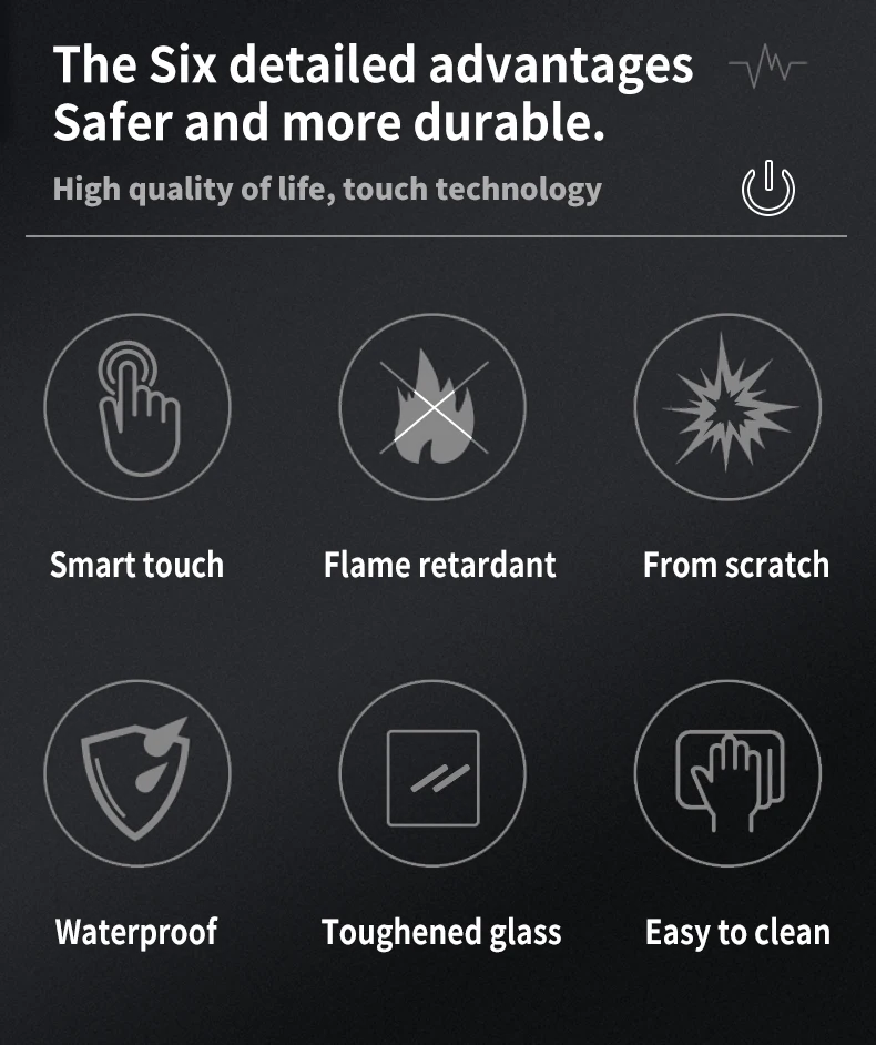 Разные цвета на выбор: белый, черный, золотой, серыйСенсорный экран с хорошей чувствительностьюДизайн светодиодного индикатораСтеклянная панель огнеупорная и водонепроницаемаяСтеклянная панель легко моется
