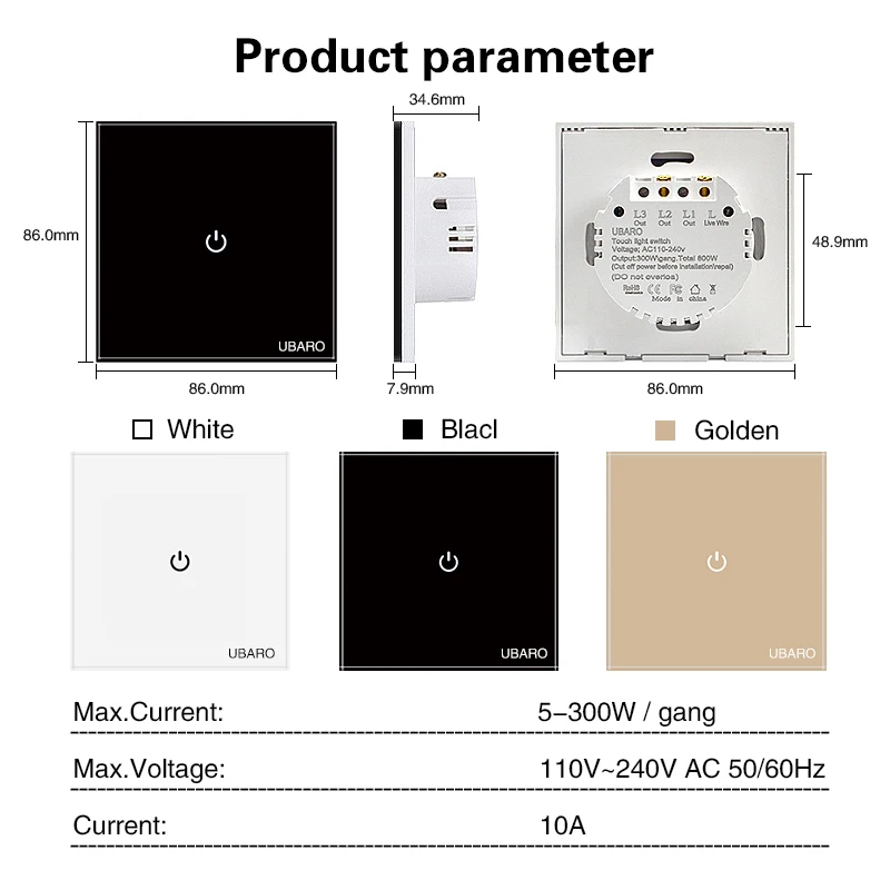 1. Название бренда: UBARO2. Кнопка: 1 банда, 2 банды, 3 банды на выбор3. Цвет: черный, белый, золотой4. Размер: 8,6*8,6*3,5 см/3,4*3,4*1,4 "(Д * Ш * В)5. Ток: 10A6. Ватт: 3-300 Вт/комплект7. Рабочее напряжение: 170-240 В переменного тока8. Рабочая температура: -20 ℃ ~ + 70 ℃9. Относительная влажность: 10% ~ 90%10. Механический срок службы: 100000 раз11. Сертификация: CE,CCC ,ROHS12. Гарантия: 1 год13. Время доставки: <3 дня получили ваш заказ14, вес брутто: 0,15 кг/5,25 oz Вес нетто: 0,14 кг/4,9 oz15. Размеры посылка: 9,0*9.0x4.0 см/3,5x3,5x1,55 (Д * Ш * В)