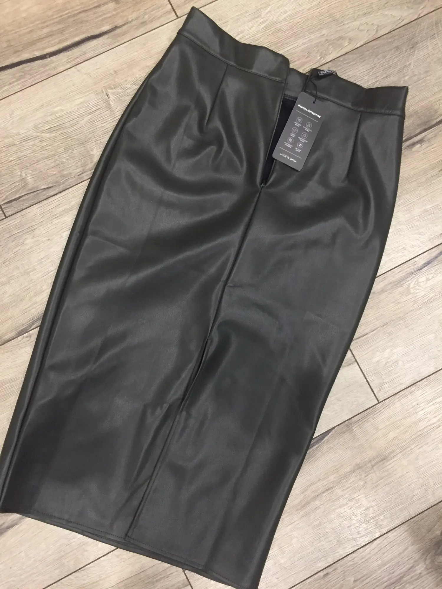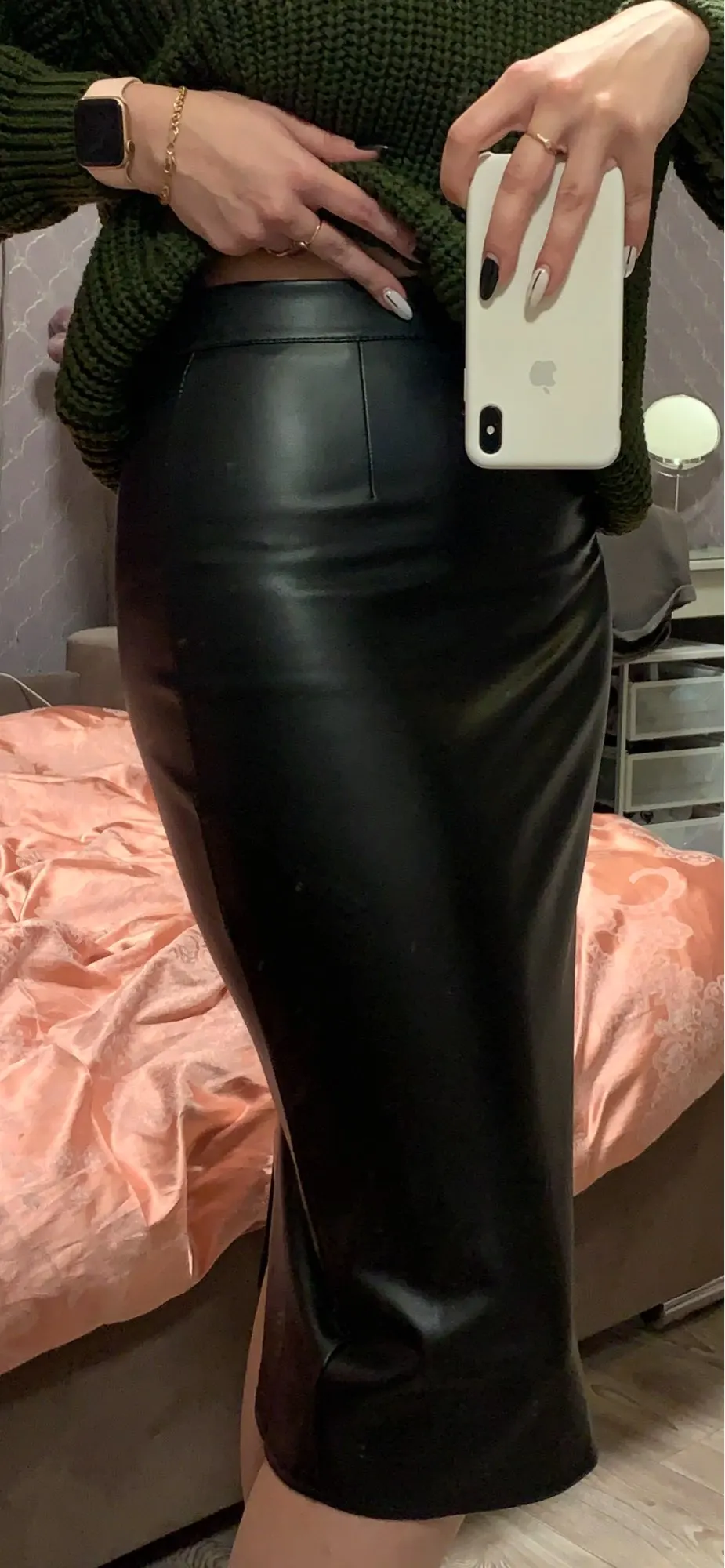 Очень красивая юбочка! Юбка очень мне понравилась, качество отличное и смотрится очень красиво! Приходит с бирками, нет ни ниток ни запаха. Материал имеет гладкую фактуру и приятен к телу, выполнена из мягкой экокожи. Длина ниже колена на мой рост 168 см. Имеются выточки спереди и сзади на талии для создания совершенного силуэта. Сзади потайная молния в цвет юбки. Имеется разрез. На свои параметры ОТ73 и ОБ98 взяла размер L.Очень довольна я юбкой.