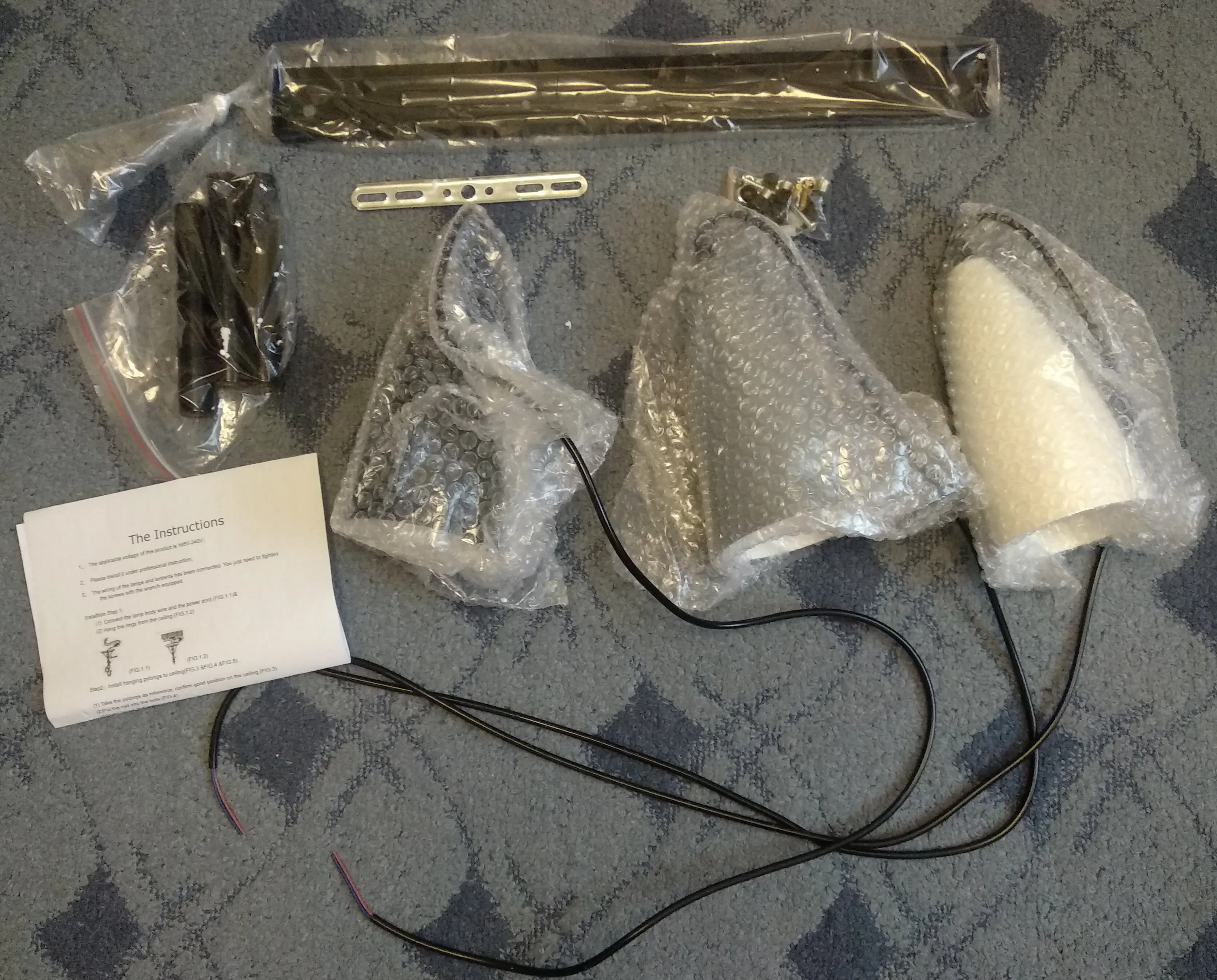 Доставка реактивная, от заказа до доставки - 4 дня. Упаковка хорошая, ничего не повредилось. Сам светильник очень хорошего качества. Плафоны металлические, крашенные. Провода качественные, толстые, длиной больше метра. Соединительная планка из тонкого металла, это единственное нарекание. В комплекте есть все необходимое для сборки и крепления, можно было бы еще добавить клеммы для соединения проводов.