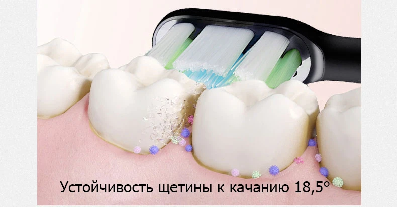 При чистке зубов щетина не деформируется относительно корпуса насадки. Эффективность очистки зубов составляет 360°. На обратной стороне отбеливающей и мягкой насадки есть щеточка для языка, вы можете освежить дыхание, не меняя насадку.