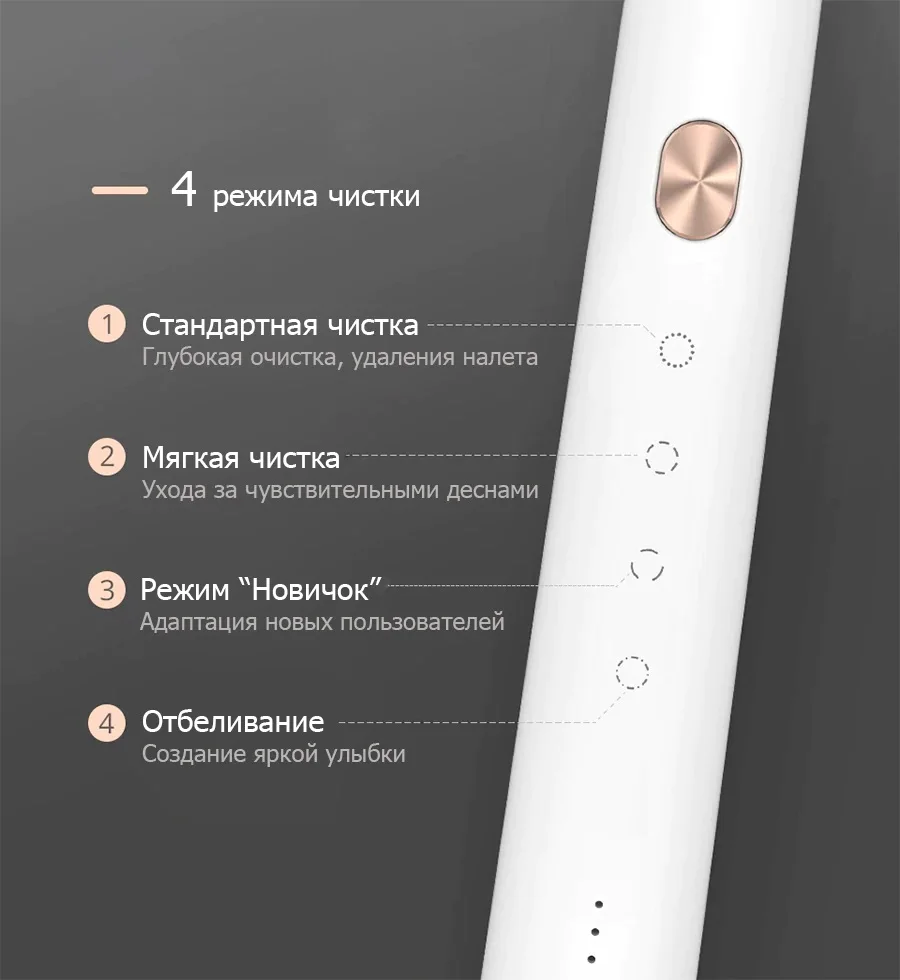 ФункцииSOOCAS X3U имеет 4 основных режима для чистки зубов. Стандартный режим для ежедневного ухода и удаления налета. Режим Мягкой чистки для ухода за чувствительными зубами и деснами, а также в период лечения воспалений. Режим «Новичок» для адаптации новых пользователей, кто в первые пользуется электрической щеткой. Режим Отбеливания в комплексе со специальной насадкой эффективно полирует зубы и делает их белее.