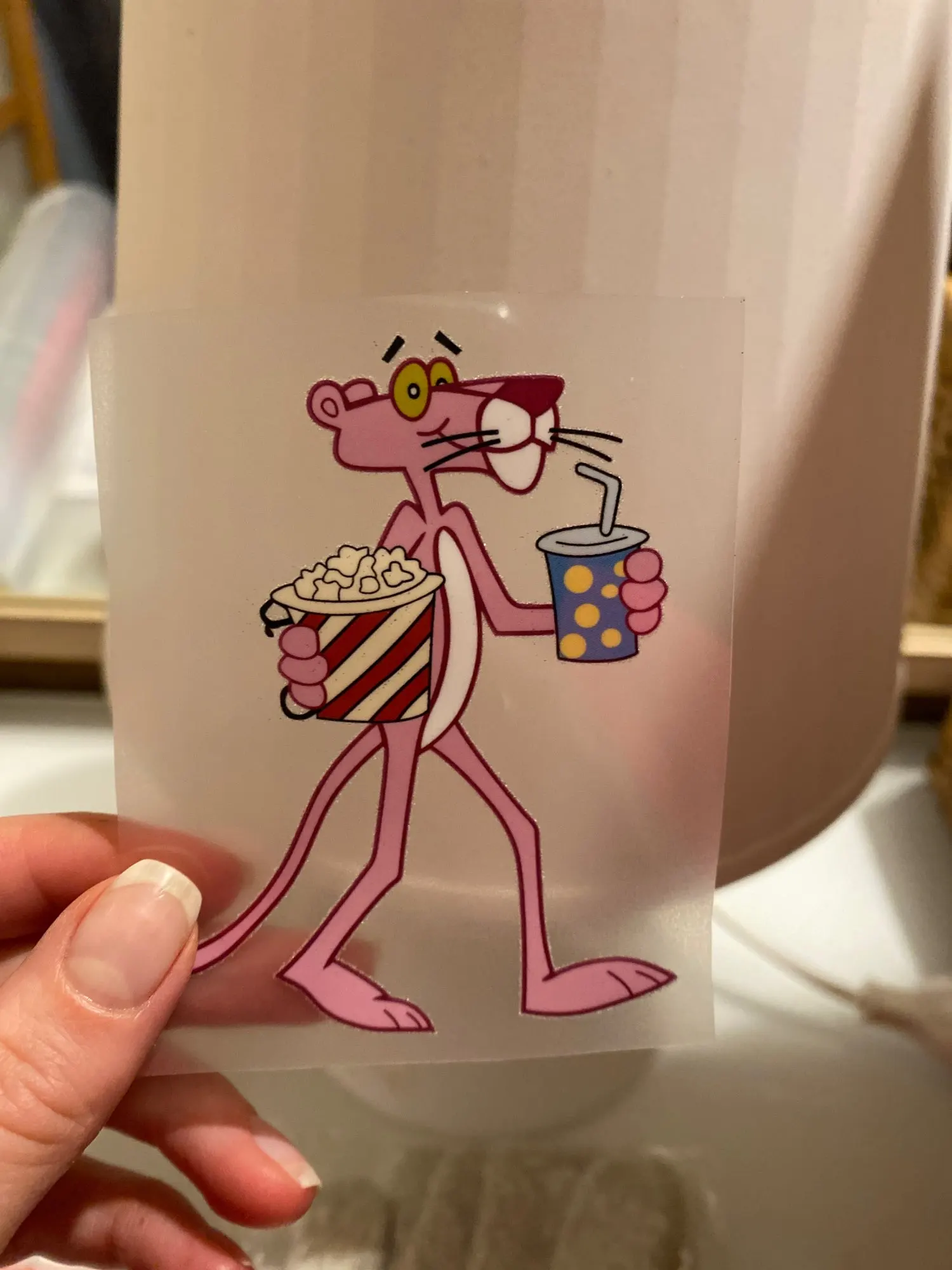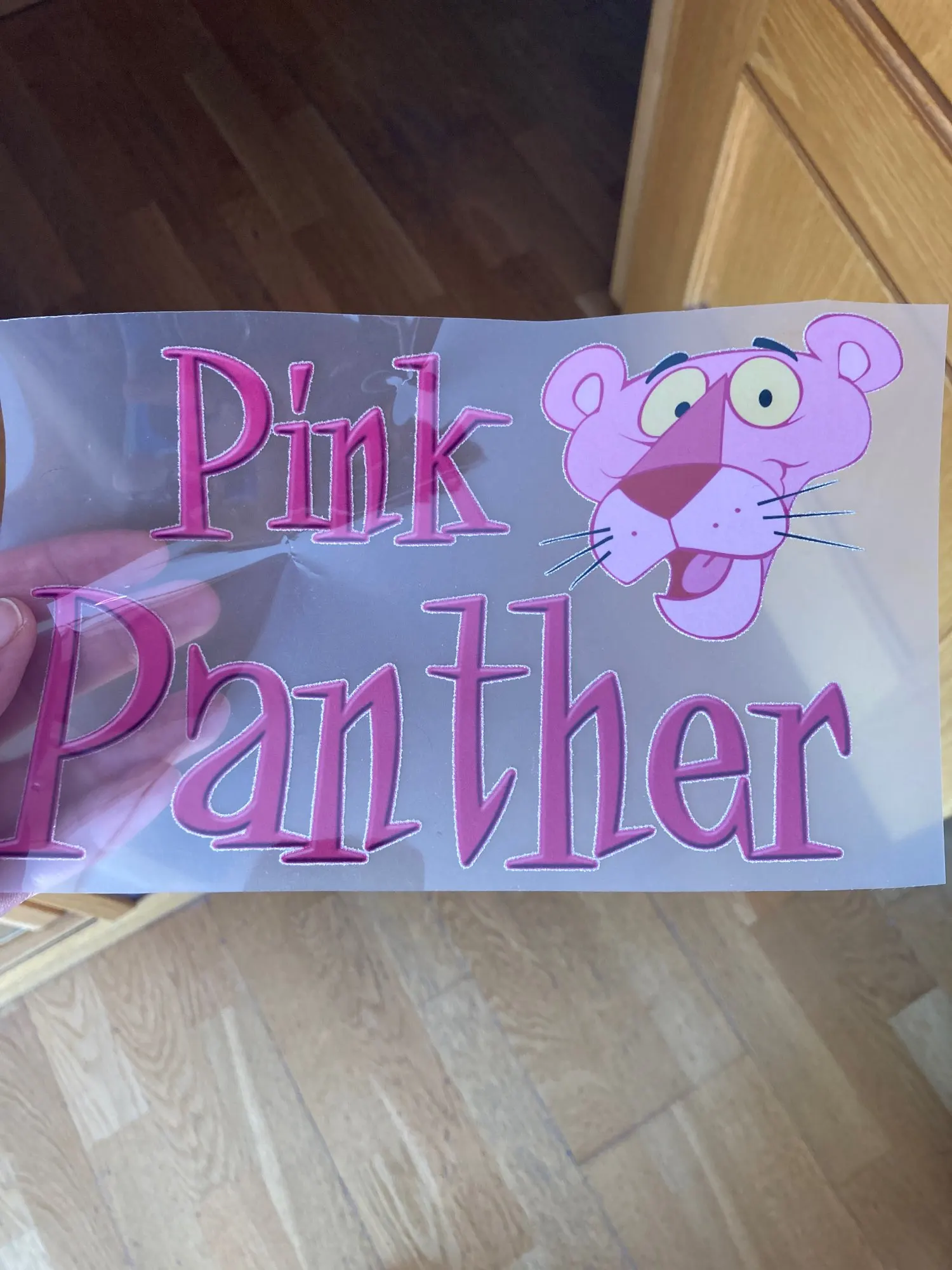 Переводная (деколь) виниловая термостойкая ткань для розовой Пантеры. Он прилипает при утюге. Изделие не украшено вышивкой. Это наклейка. Точные измерения. Железная виниловая передача для ткани розовой Пантеры. Гладильная передача. Это не вышивка, это наклейка. Идеальное измерение.