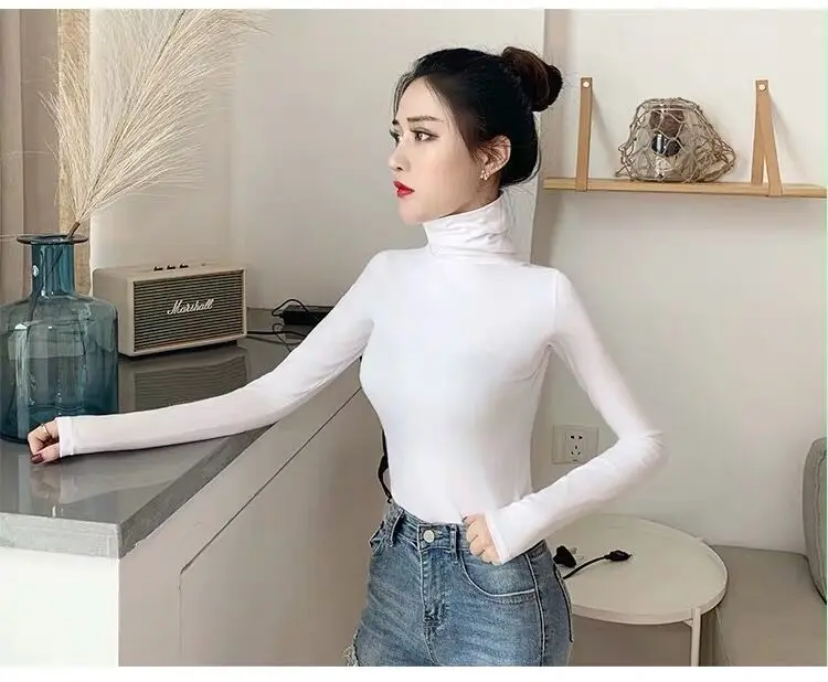 Женские футболки с высоким воротом, тонкие осенние простые Универсальные женские сексуальные базовые мягкие повседневные футболки в Корейском стиле Ulzzang