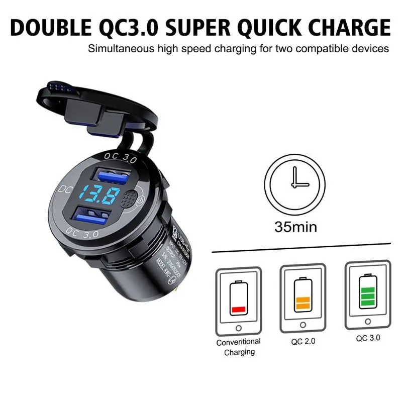 Описание:OOTDTYРазъем зарядного устройства usb имеет два порта быстрой зарядки 18 Вт/3 А QC3.0, обеспечивает скорость зарядки 4x совместимым устройствам. Обратная совместимость с QC 2,0 и 1,0 и обеспечивает максимально быструю зарядку всех устройств без быстрой зарядки.Многоцелевой источник питания для мобильных телефонов, планшетных ПК, GPS и других usb-устройствВстроенный usb-разъем зарядного устройства с светодиодный дисплеем напряжения, который может показать состояние напряжения автомобильного аккумулятора во времени. Очень полезно для автомобилей, лодок, велосипедов, внедорожников, ATV, RV автомобилей, кемперов и мотоциклов и т. Д.С водонепроницаемым классом IP66, имеет хороший водонепроницаемый и пылезащитный эффект, с выключенным выключателем, прост в использовании и экономии энергии.Широкое применение: автомобили, мотоциклы, квадроциклы, внедорожники, внедорожники, лодки, морские, автобусные и многое другое.Характеристики:Материал изделия: алюминийЦвет изделия: черный, синий, красный, золотойСветодиодный Цвет: красный, зеленый, синийДлина кабеля питания: 60 смВход Напряжение: 12V - 24VВыход USB 1: V/3A;9V/2A;12V/1.5AВыход USB 2: 5 В/3 А; 9 В/2 А; 12 В/1,5 АРазмер: 50x36.8x28.6 ммПримечание:1. Перевод ед. измерения: 1 см = 10 мм = 0,39 дюймов2. Допускается погрешность в 0-1 см из-за ручного измерения. Пожалуйста, убедитесь, что вы не возражаете, прежде чем сделать ставку.3. Из-за разницы между различными мониторами изображение может не отражать фактический цвет изделия. Спасибо!Посылка включает в себя:1 X QC 3,0 Автомобильное двойное USB зарядное устройство с светодиодный вольтметр на выключенном выключателе1 х Кабель питания