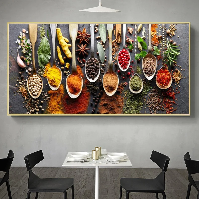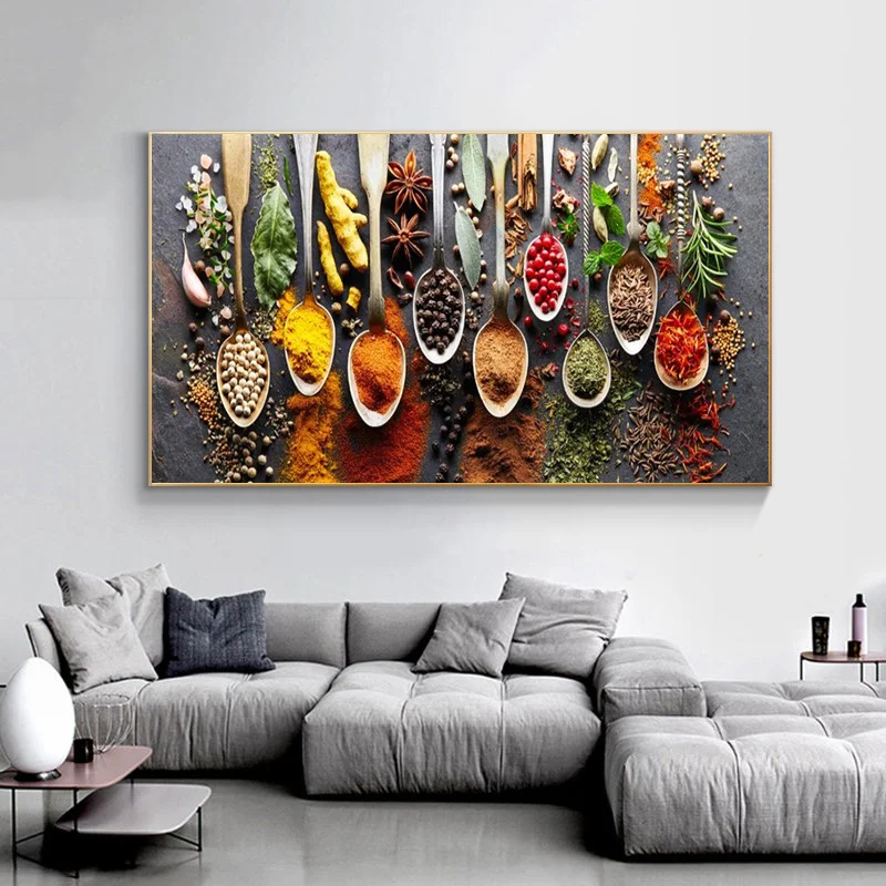 Красочная картина специи и ложка в столе на холсте, постеры на тему кухни, печать на стене, картина для готовки и ингредиентов, домашний декор