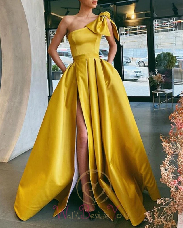 Атласное платье на одно плечо, с разрезом спереди, ТРАПЕЦИЕВИДНОЕ, желто-белое