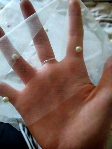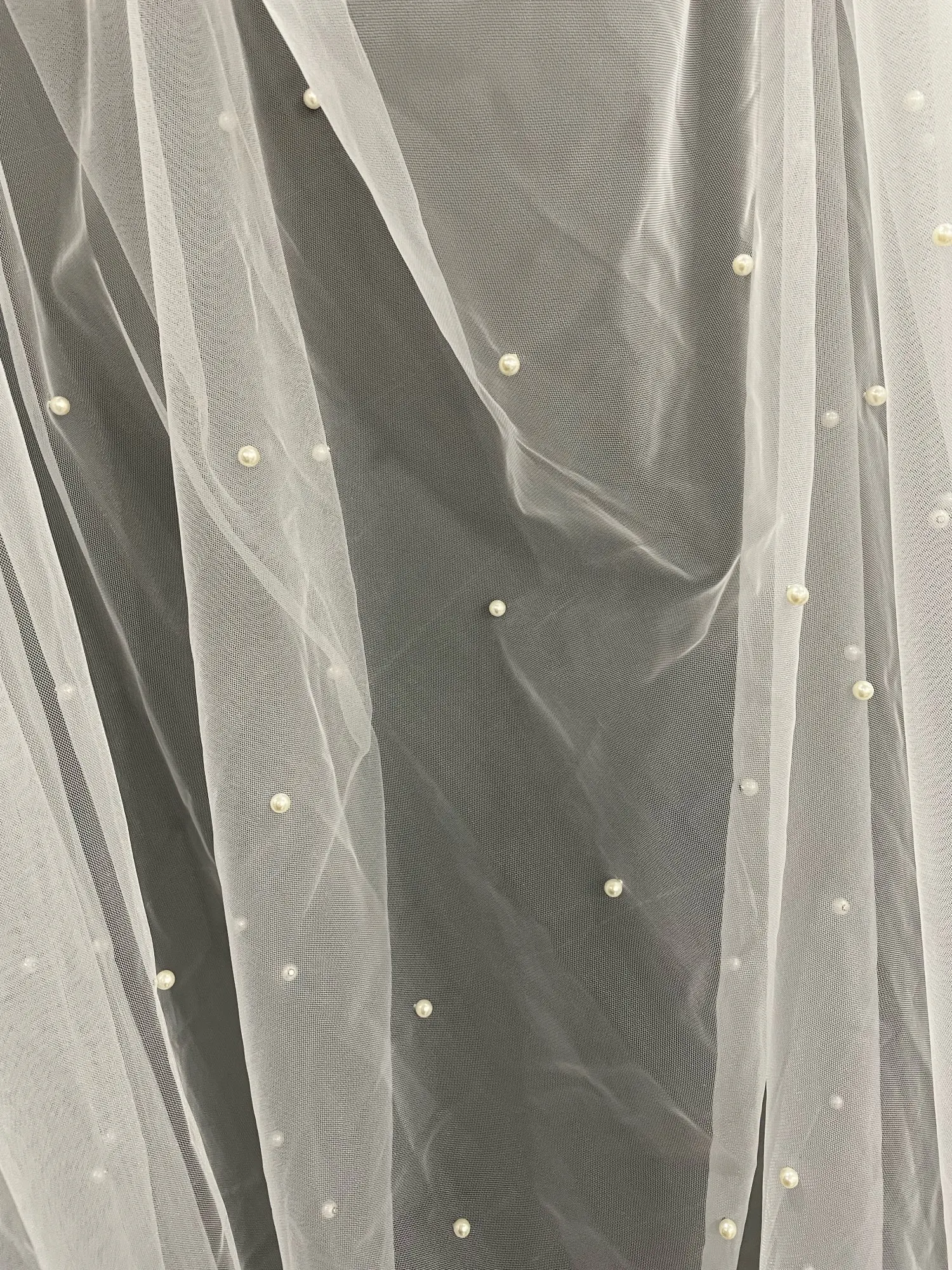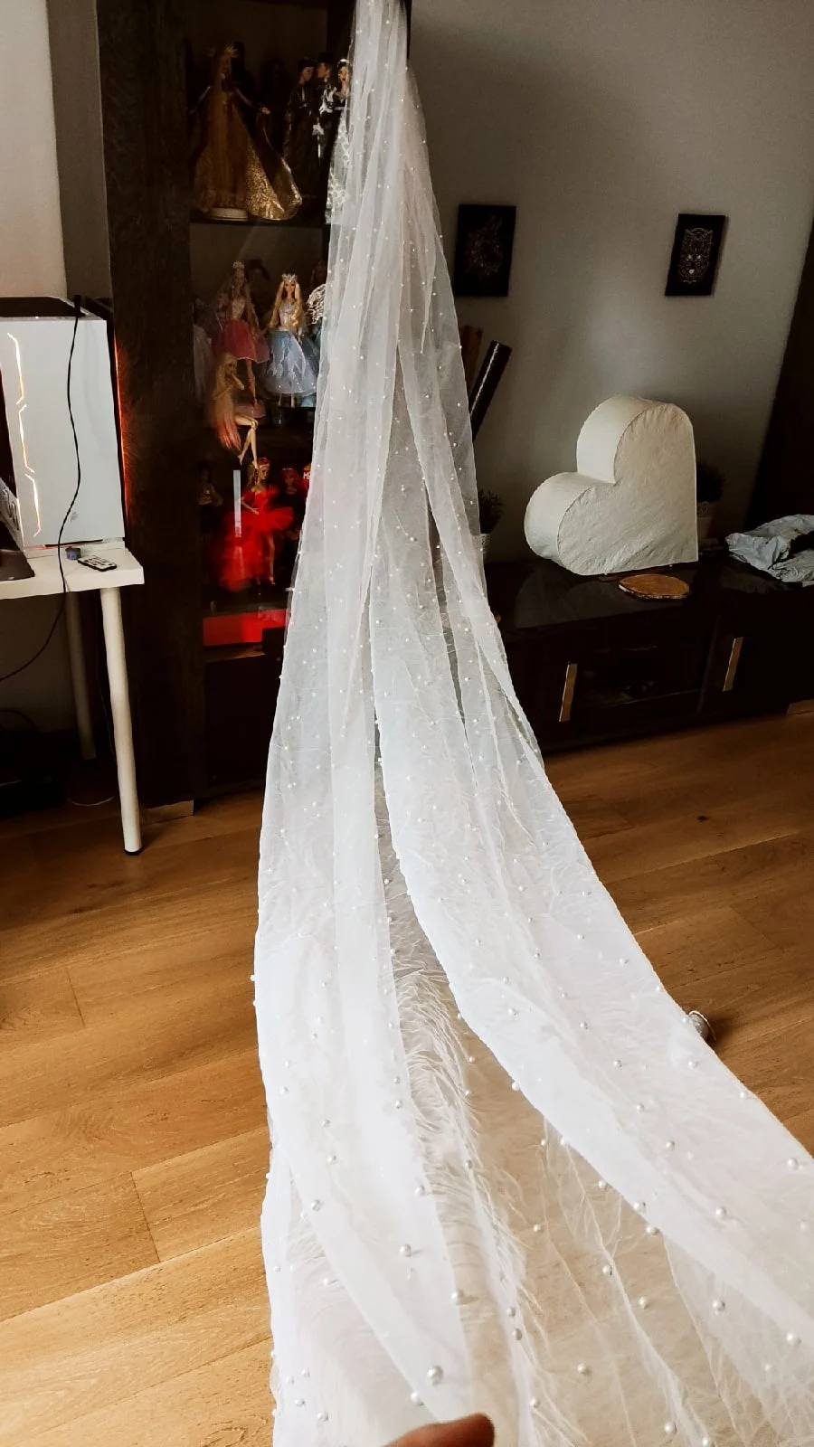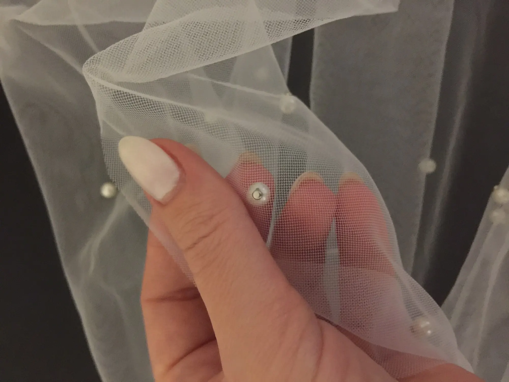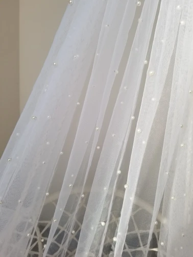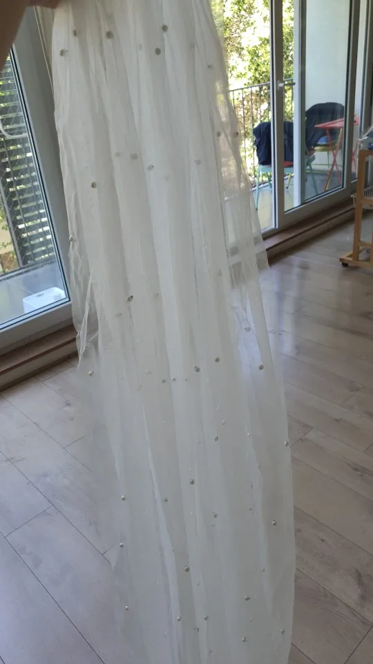 Просто потрясающая фата, я расплакалась от счастья, когда получила ее. Она очень мягкая, бусинки закреплены с двух сторон, зажимая ткань фаты между собой. Так что бусинки не отпадут - это точно. Взяла самую большую длину, в тон к моему платью - просто прелестно :)