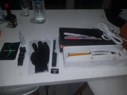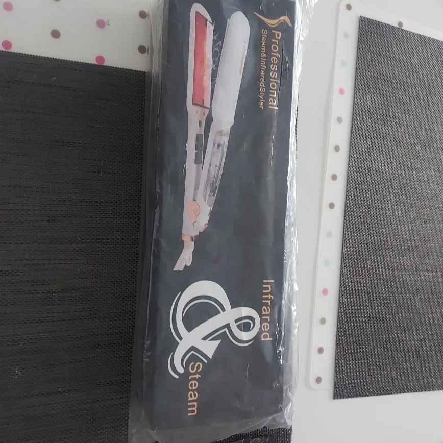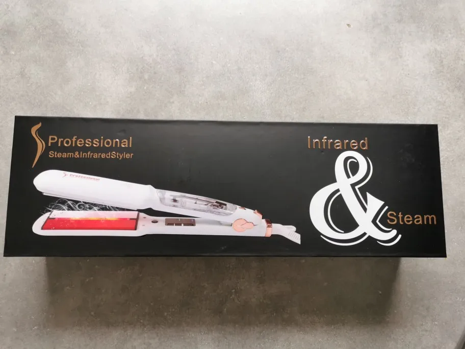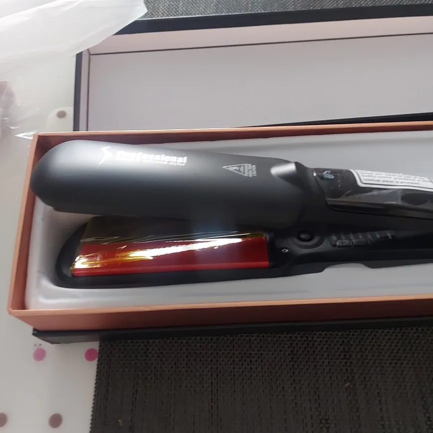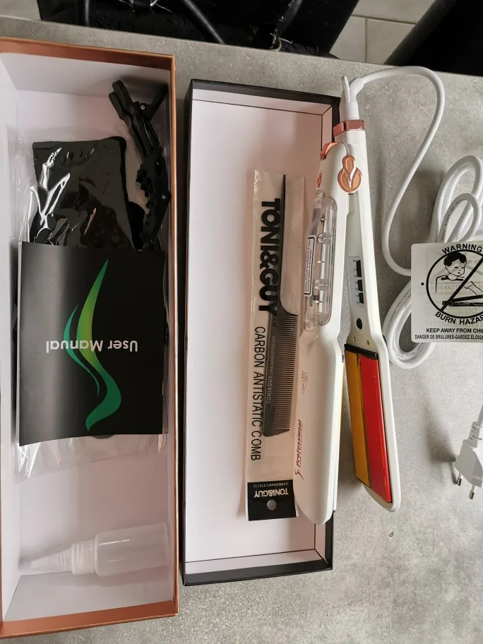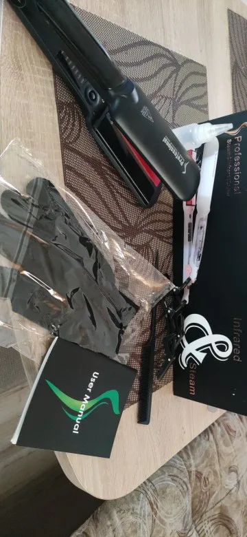 Делает волосы гладкими, лоток для воды также отлично работает с регулируемым количеством пара, нагревается через минуту. В этот отличный выпрямитель для волос были добавлены 2 машинки для стрижки волос, антистатические расчески, перчатки, бутылка для воды для легкого наполнения лотка, перчатки и руководство по эксплуатации. На мои руки ушло 5 дней. Работает так же идеально, как эти 100 + евро стоимость от "профессиональных" магазинов.