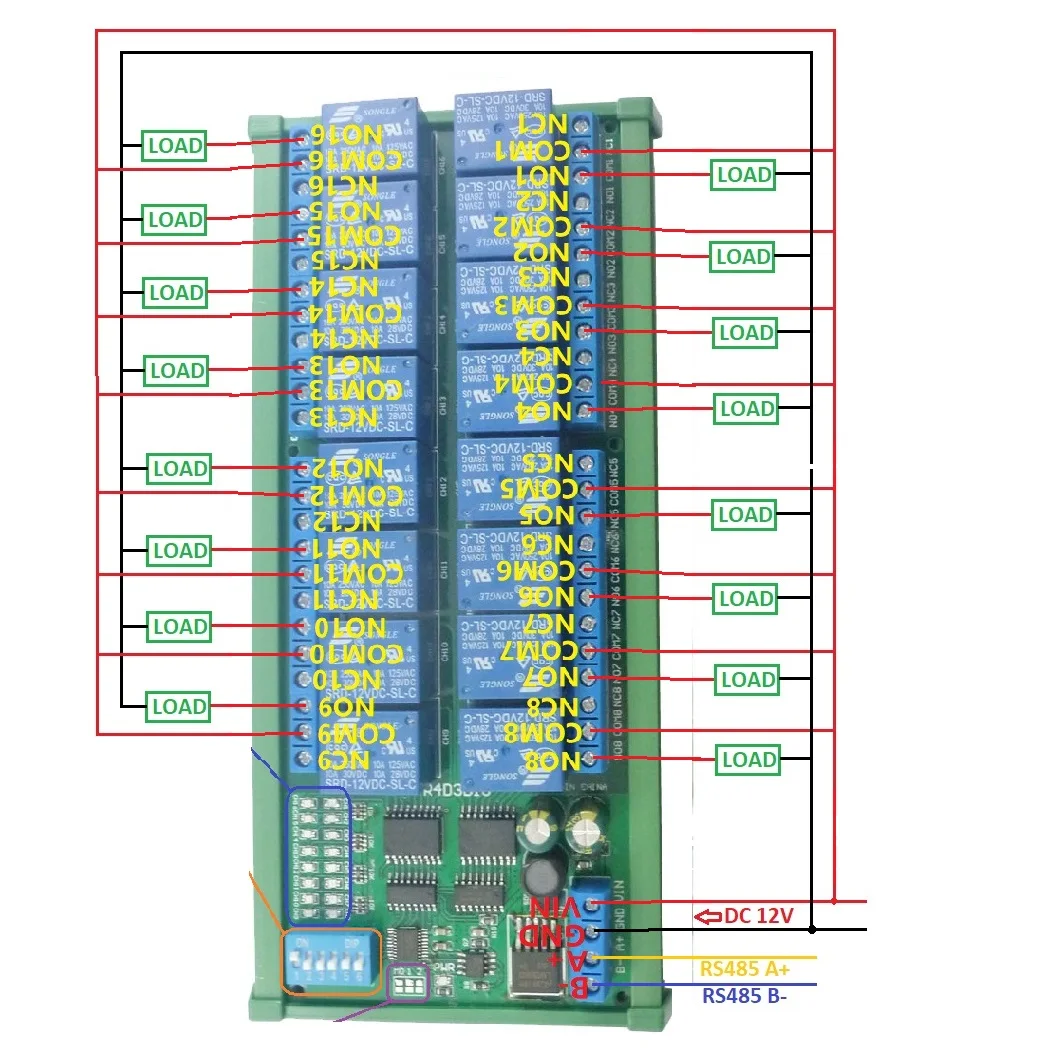 Название продукта: релейный модуль Modbus RTU UART, 12 В постоянного тока, DIN35, C45, 16-канальный релейный модуль RS485, панель управления для ПЛК, PTZ, мотор камеры, светодиод