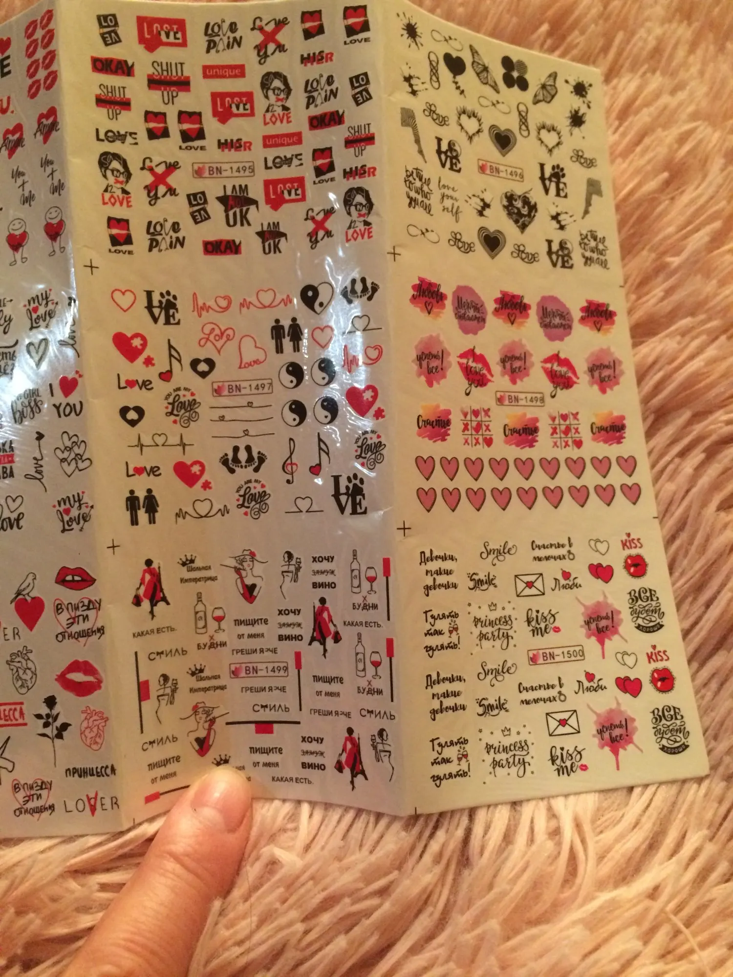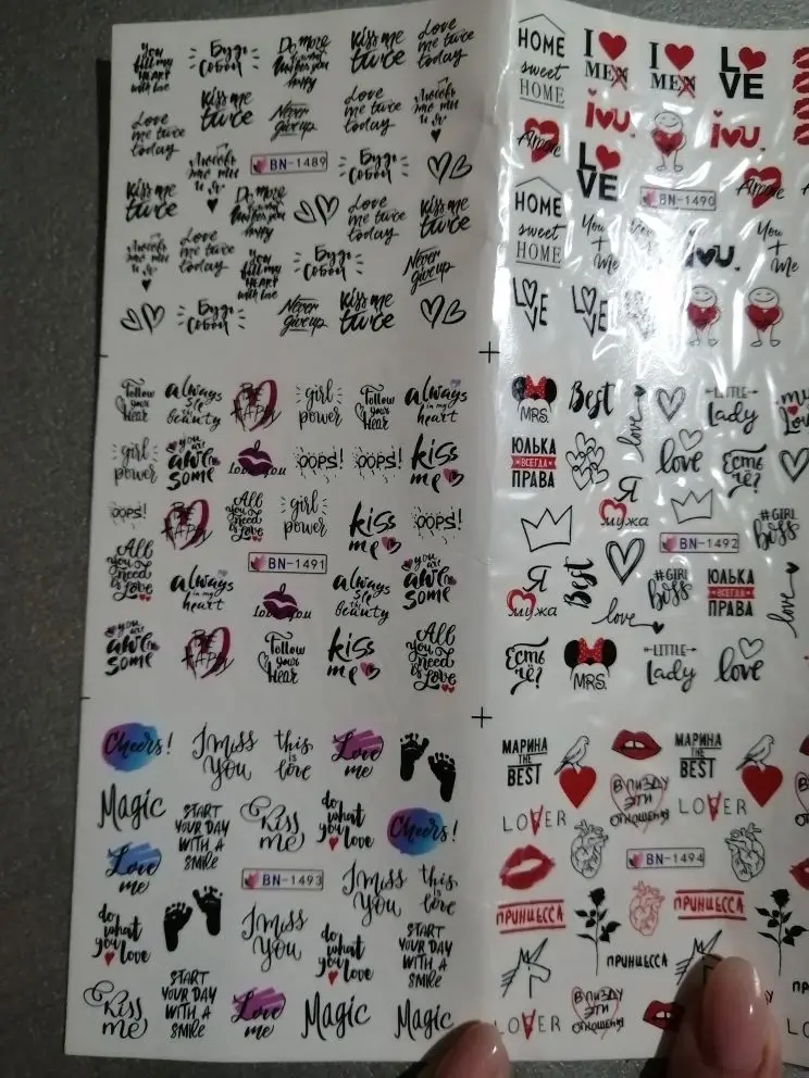 наклеек очень много ,некоторые не умещаются на ноготь ,вместе с набором пришла мини пилочка ,очень мило .очень классные надписи