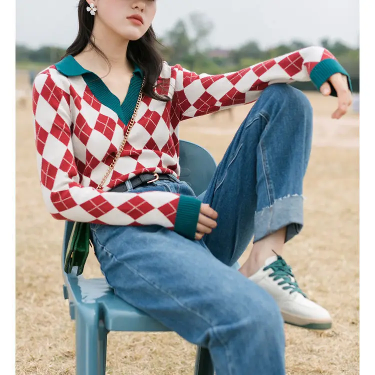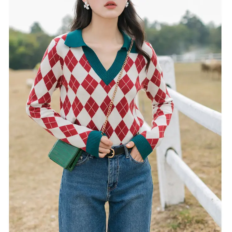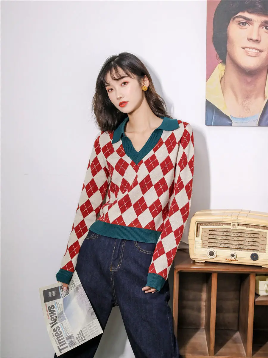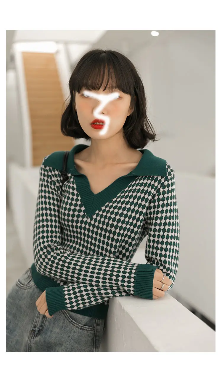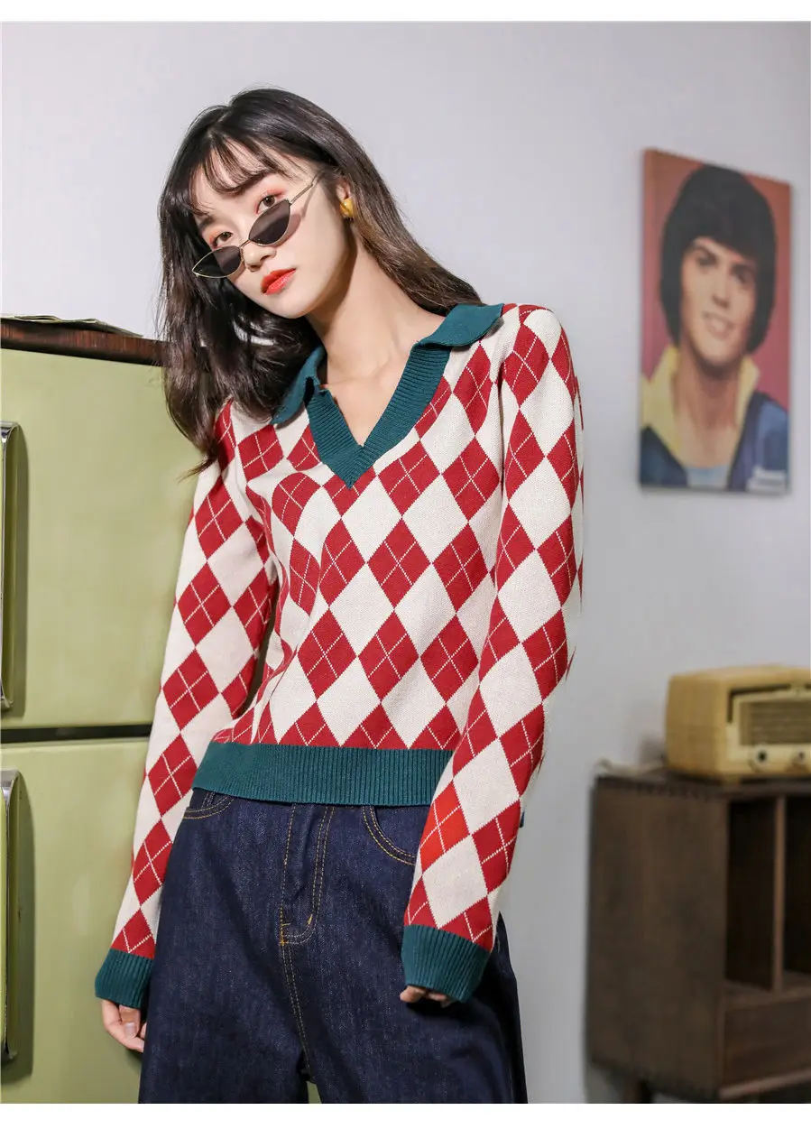 Модный клетчатый винтажный женский свитер, пуловеры, топы на каждый день, осень, v-образный вырез, длинный рукав, элегантный женский милый вязаный свитер