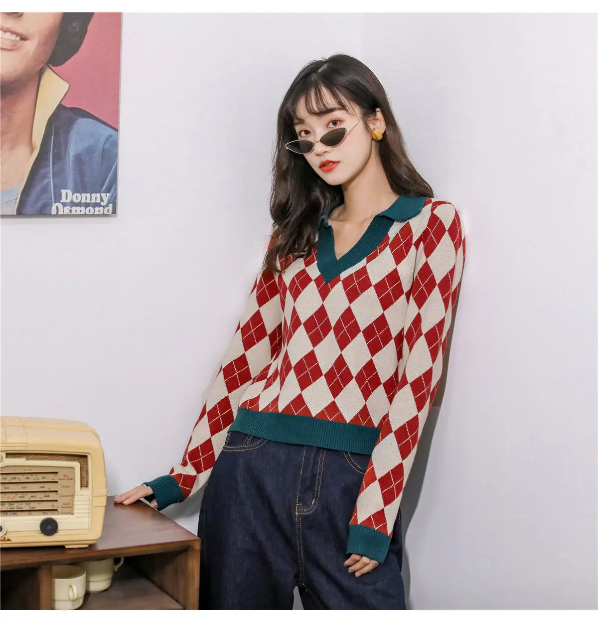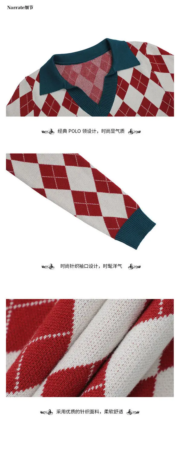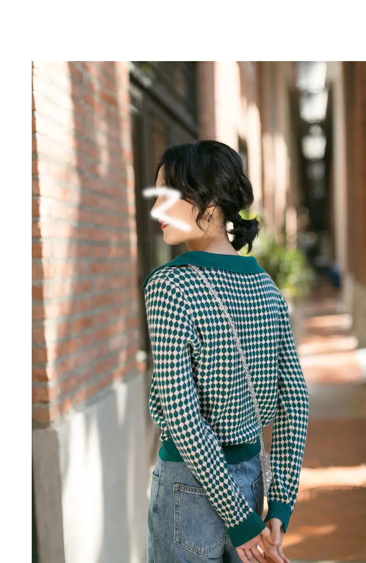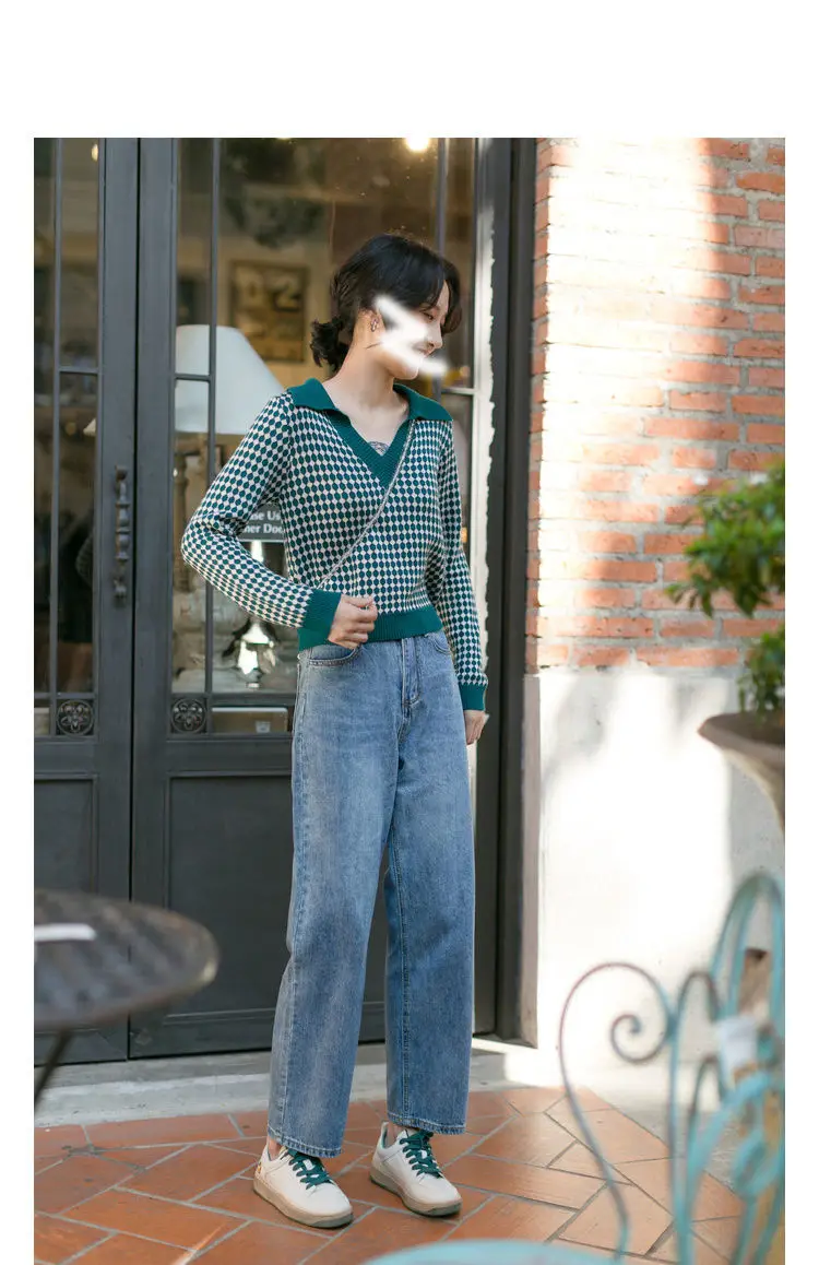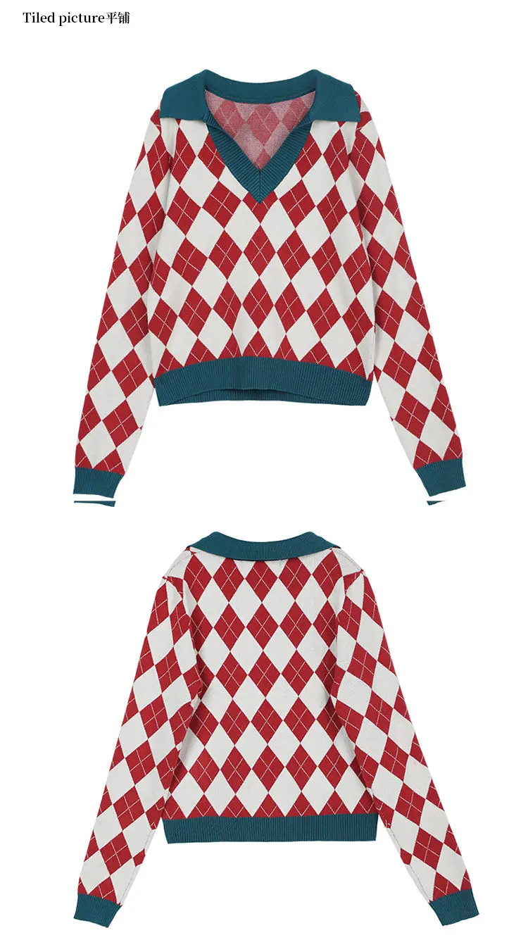 Модный клетчатый винтажный женский свитер, пуловеры, топы на каждый день, осень, v-образный вырез, длинный рукав, элегантный женский милый вязаный свитер