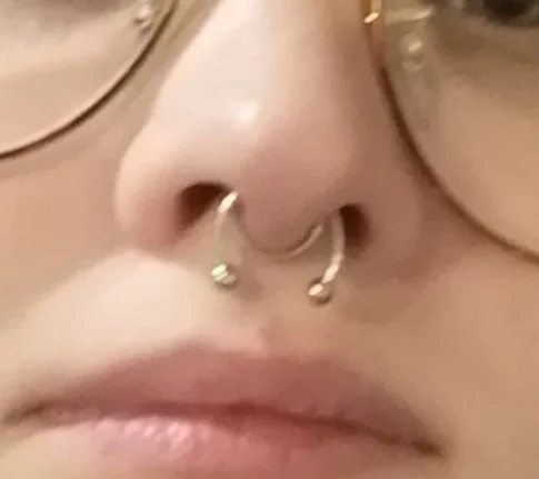 очень крутой септум, правда немного великоват. если его самостоятельно сжать, то носится прекрасно, 10/10 , оч красиво смотрится, с продавцом не общалась, быстрая доставка