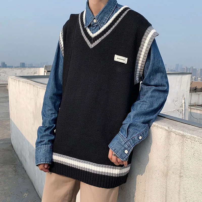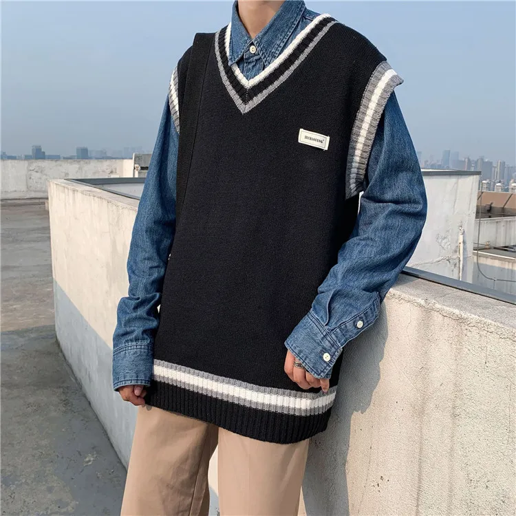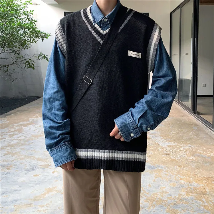 Жилет мужской с V-образным вырезом, трикотажный пуловер в стиле пэчворк, жилет оверсайз в стиле Харадзюку, студенческие жилеты в Корейском стиле, Осень-зима 2021