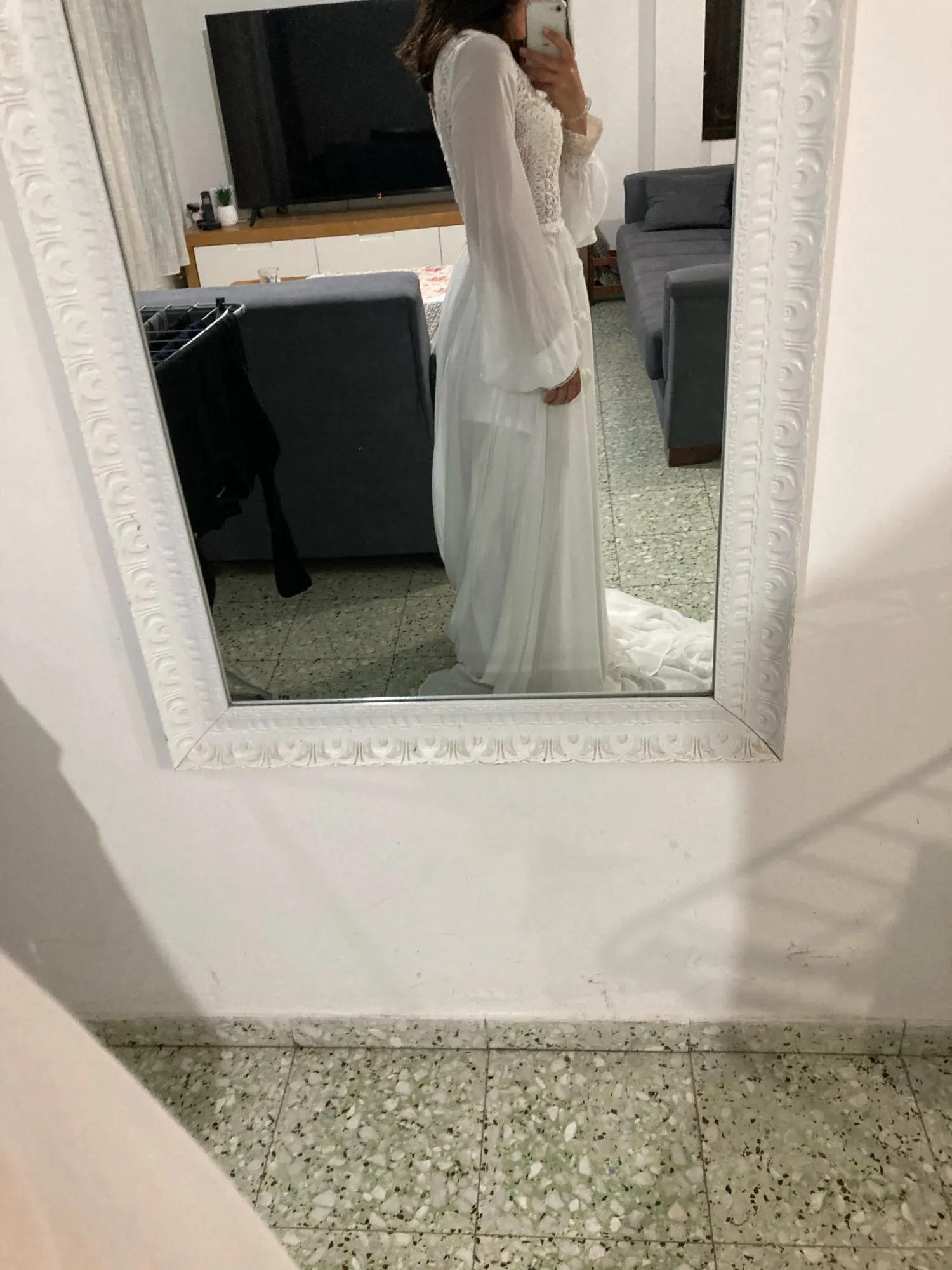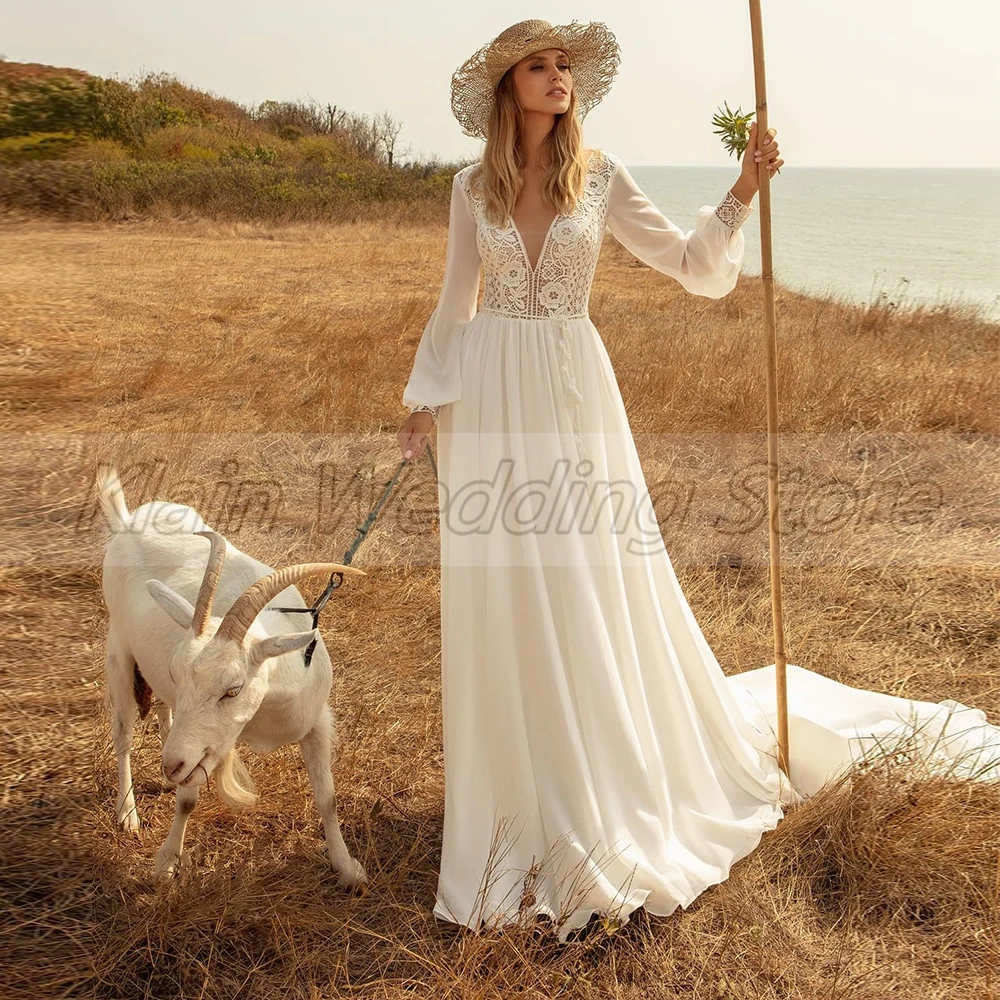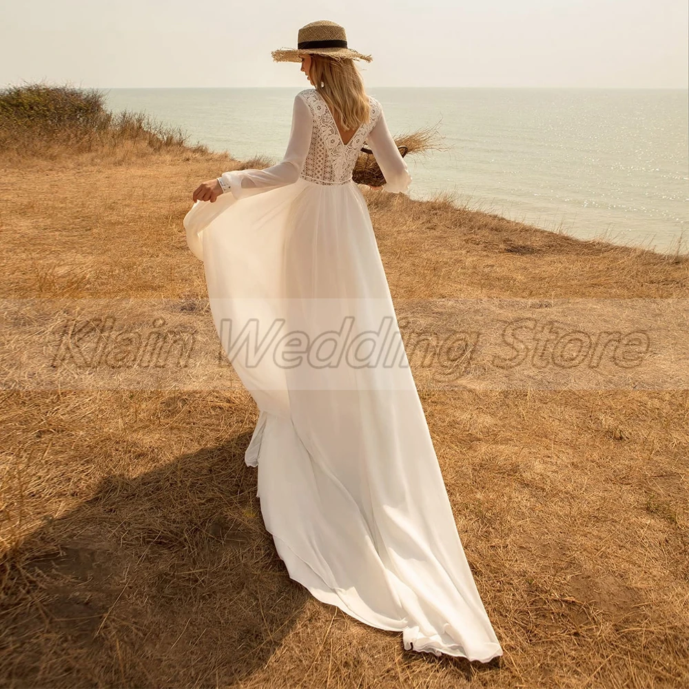 Платье свадебное с Элегантное длинное шифоновое рукавом, кружевное трапециевидное в стиле бохо, с V-образным вырезом, аппликация, со шлейфом, 2021