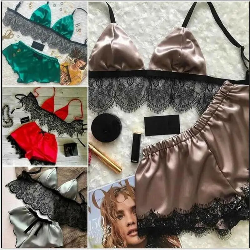 Женская кружевная атласная шелковая одежда для сна, бюстгальтер + шорты, ночное белье, пижамный комплект, Сексуальная кружевная одежда для сна, модная женская одежда