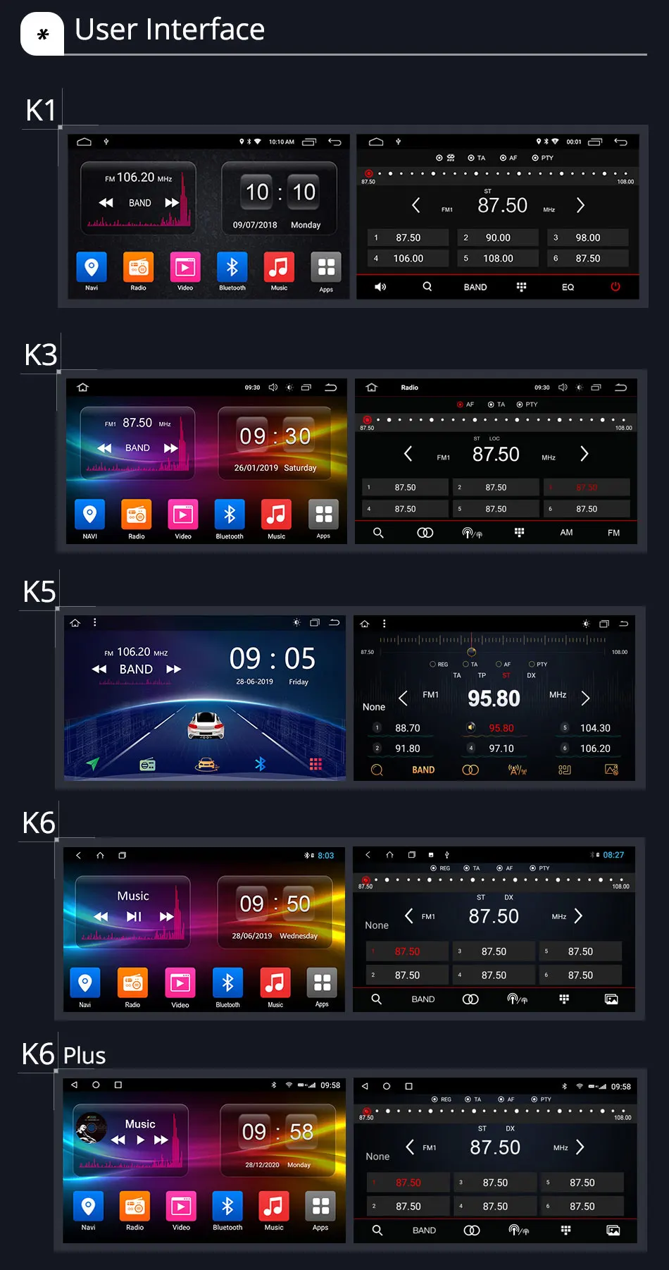 У нас есть следующие решения для удовлетворения различных требований покупателя: K6 Plus 128G ---UIS7862| Android 10,0 |8 ядер(A75 * 2 + A55 * 6)|6G + 128G| 2.5D + IPSQLED1280*720|Радио 7708 | Усилитель 7851L K6 Plus 64G ---UIS7862| Android 10,0 |8 ядер(A75 * 2 + A55 * 6)|4G + 64G | 2.5D + IPSQLED1280*720|Радио 7708 | Усилитель 7851L K6 Plus 32G ----UIS7862| Android 10,0 |8 ядер(A75 * 2 + A55 * 6)|3G + 32G | 2.5D +IPSQLED1280*720|Радио 7708 | Усилитель 7388 K3-PX5 ------ PX5 | Android 10,0 | 2G + 32GB | 2.5D + TN | Радио TEF7786 | Усилитель TDA7388| DSP K3-PX5 ------ PX5 | Android 10,0 | 4G + 64GB| 2.5D + IPS |1280*720| Радио TEF6686 | Усилитель TDA7851L| DSP K3-PX6 ------ PX6 | Android 10,0 | 4G + 64GB | 2.5D + IPS |1280*720| Радио TEF6686 | Усилитель TDA7851L| DSP|HDMI K3-PX6 ------ PX6 | Android 10,0 | 4G + 64GB | 2.5D + IPS |1280*720| Радио TEF6686 | Усилитель TDA7851L| DSP|HDMI| 8-канальный цифровой обработки сигналов K6-Low ------ SC9853 | Android 8,1 | 2G + 32GB | 2.5D + TN | Радио TDA7786 | Усилитель TDA7388| DSP|SPDIF K6-High ------ SC9853 | Android 8,1 | 4G + 64GB | 2.5D + IPS |1280*720| Радио TDA7708 | Усилитель TDA7851L| DSP|SPDIF K5-Low ------ T7 | Android 7,1 | 2G + 16GB | 2.5D + TN | 1024*600 | Радио TDA7786 | Усилитель TDA7388| DSP|SPDIF K5-High ------ T7 | Android 7,1 | 2G + 32GB | 2.5D + IPS | 1024*600 | Радио TEF7708 | Усилитель TDA7851L| DSP| SPDIF K1-Low ------ AC8227L | Android 6,0 | 1G + 16GB | 2.5D + TN | 1024*600 | Радио TDA7786 | Усилитель TDA7388 K1-High ------ AC8227L | Android 8,1 | 2G + 16GB | 2.5D + TN | 1024*600 | Радио TDA7786 | Усилитель TDA7388