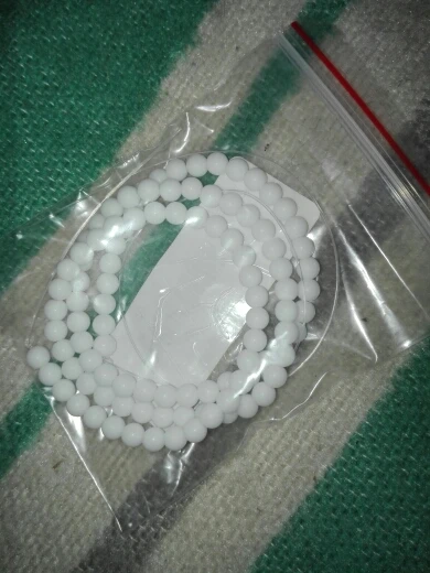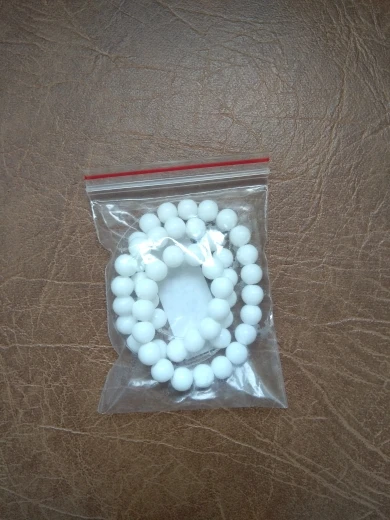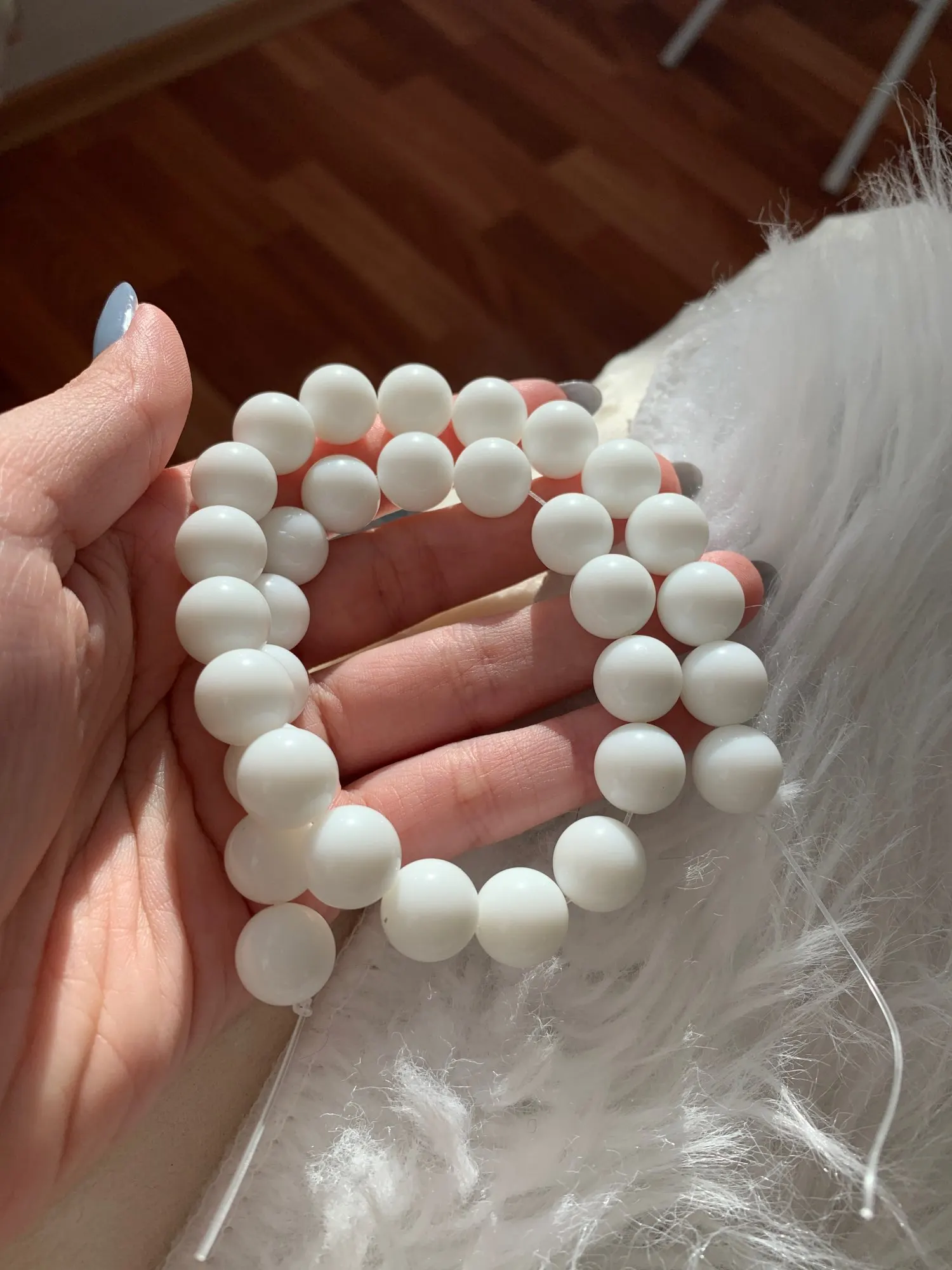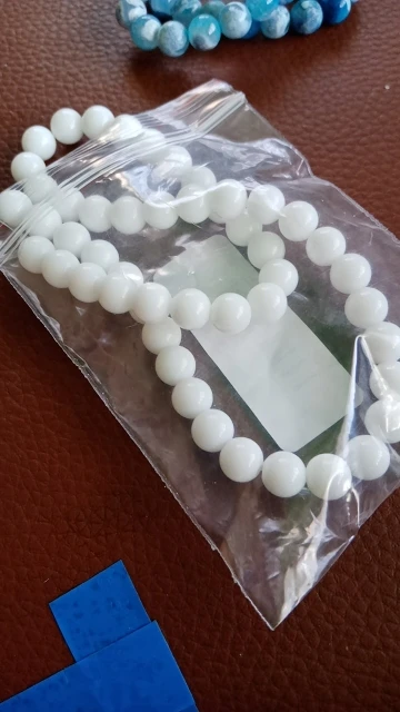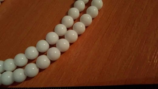 Это не камень! В который раз выписываю белый агат и у всех продавцов одно и тоже- вместо агата присылают то ли пластик, то ли керамику. Бусины легкие, не холодные на ощупь, не горят, не плавятся, расколоть не смогла...Из чего сделана имитация не понятно...