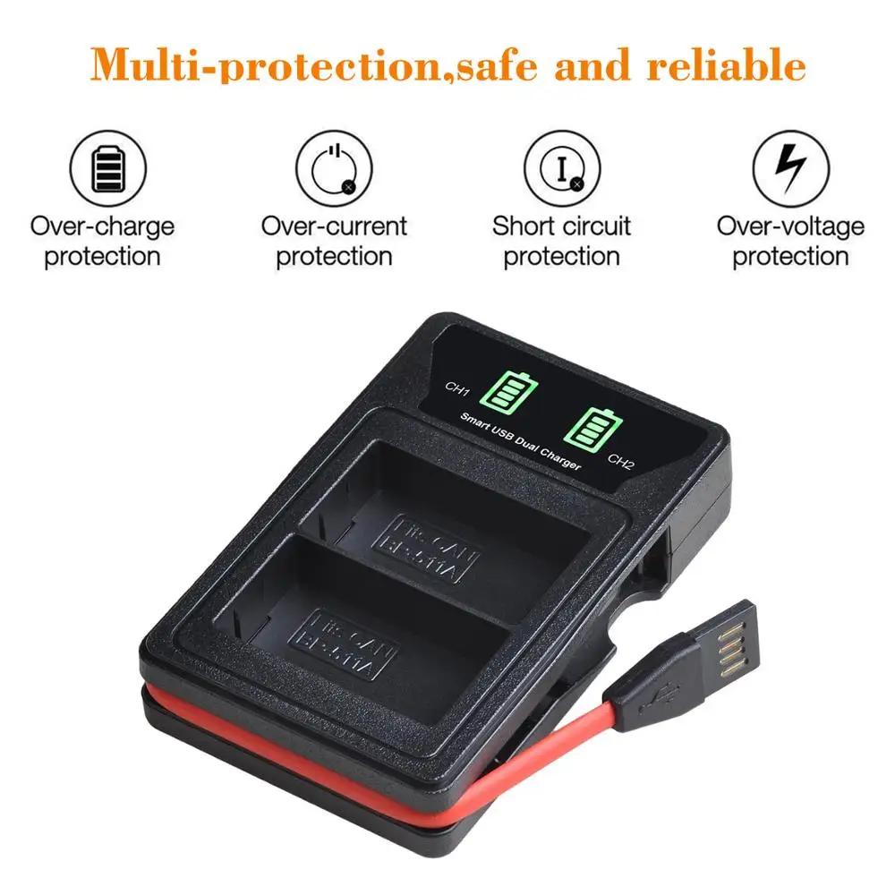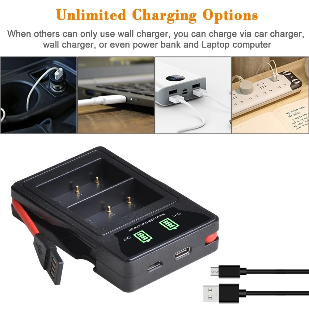 2-канальный Зарядное устройство: Зарядка двух аккумуляторов одновременно и быстро, значительно сэкономить ваше время. Этот дизайн подходит для длительных поездок и быстро удовлетворяет ваши потребности.