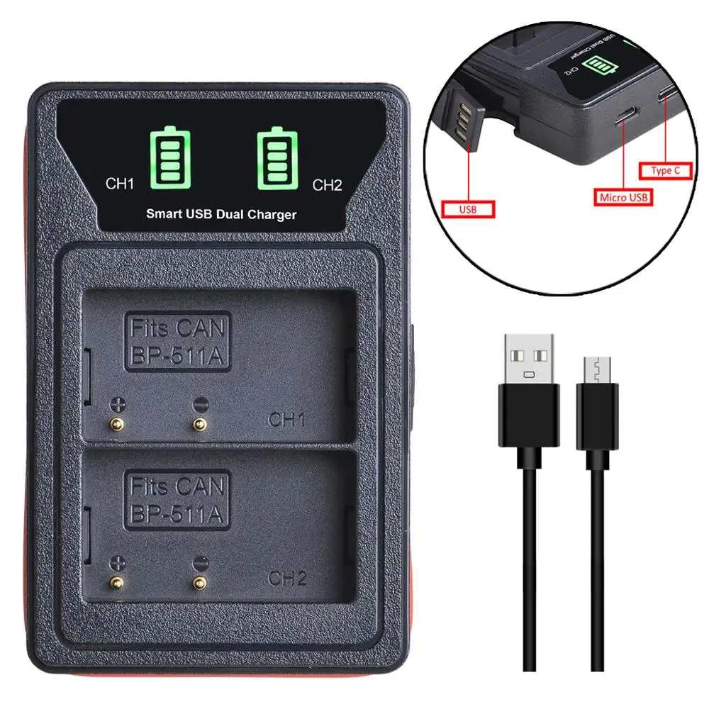BP-511 BP-511A BP511 BP511A аккумулятор + светодиодный встроенный USB двойное зарядное устройство для Canon G6 G5 G3 G2 G1 EOS 300D 50D 40D 30D 20D 5D