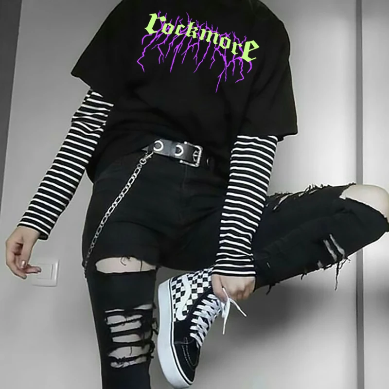 Женский в Корейском стиле футболки, повседневные, с графическим рисунком, черные, в стиле Харадзюку, в готическом стиле, женские топы, кавайная одежда