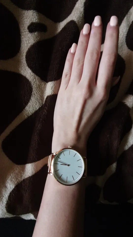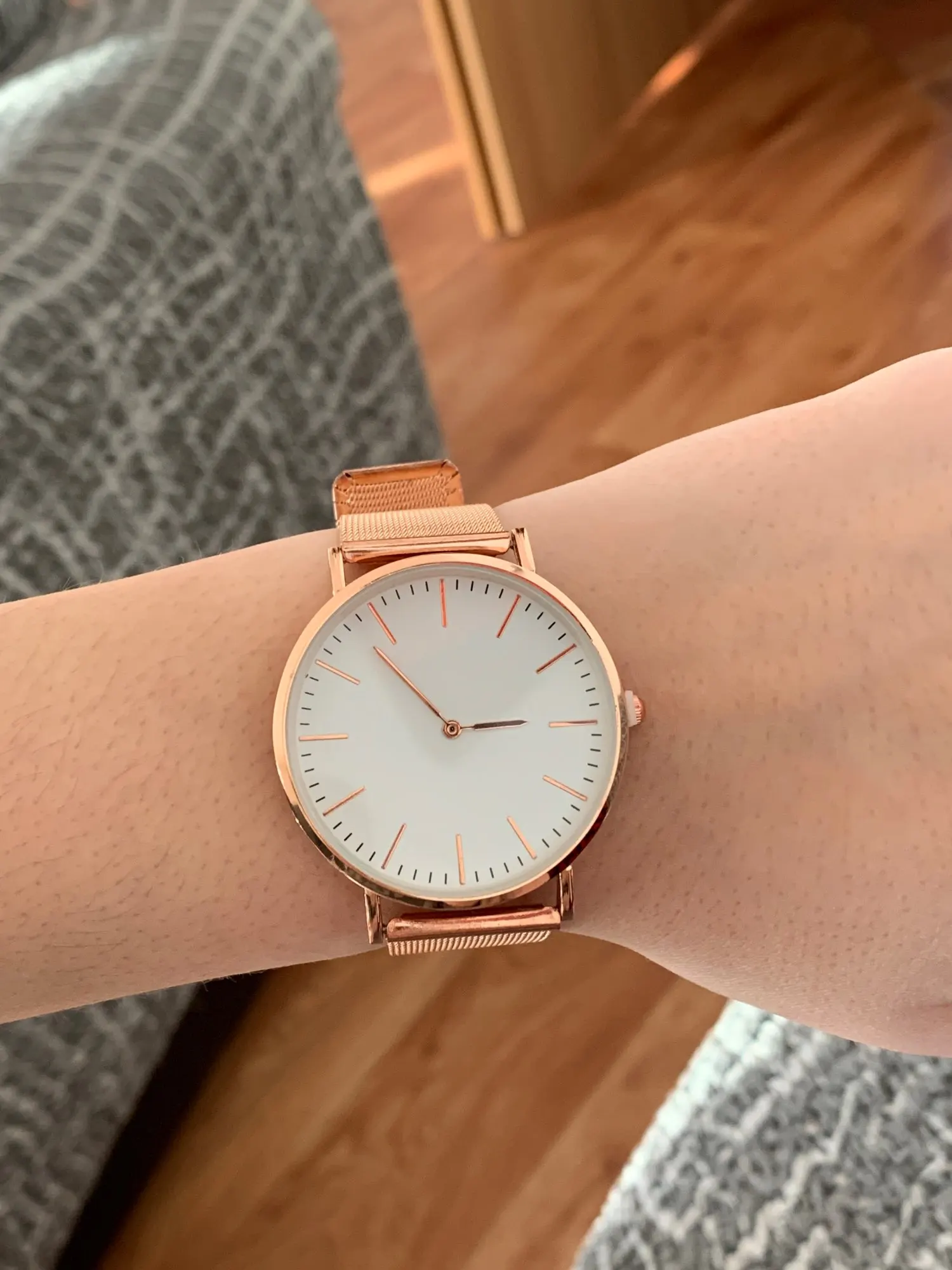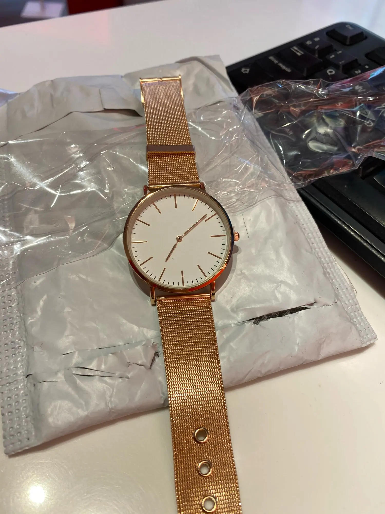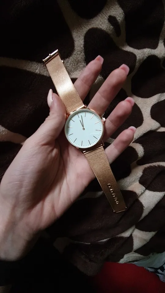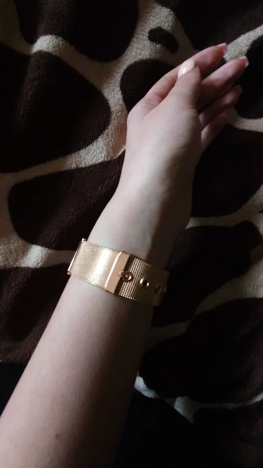 Ремешок довольно хорошего качества. Я взял тот, который имеет золотой и черный циферблат, золотой цвет больше похож на розовое золото-покрытие, а на ремешке крючок Серебристый