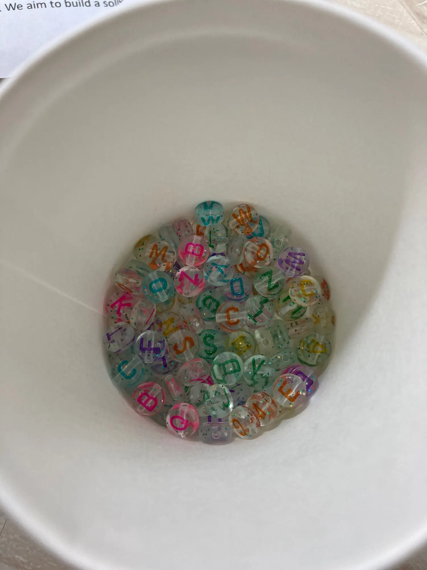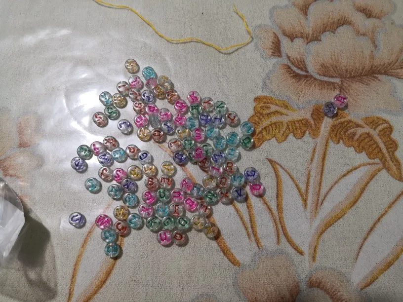 Бусины хорошего качества, правильный размер и форма :) желтые буквы почти не появляются, что огорчительно, но остальные хорошо видны даже без вспышки. * Использованная вспышка на картинке, которую я сделал в полной коробке, но нет вспышки там, где я держу один желтый шарик.