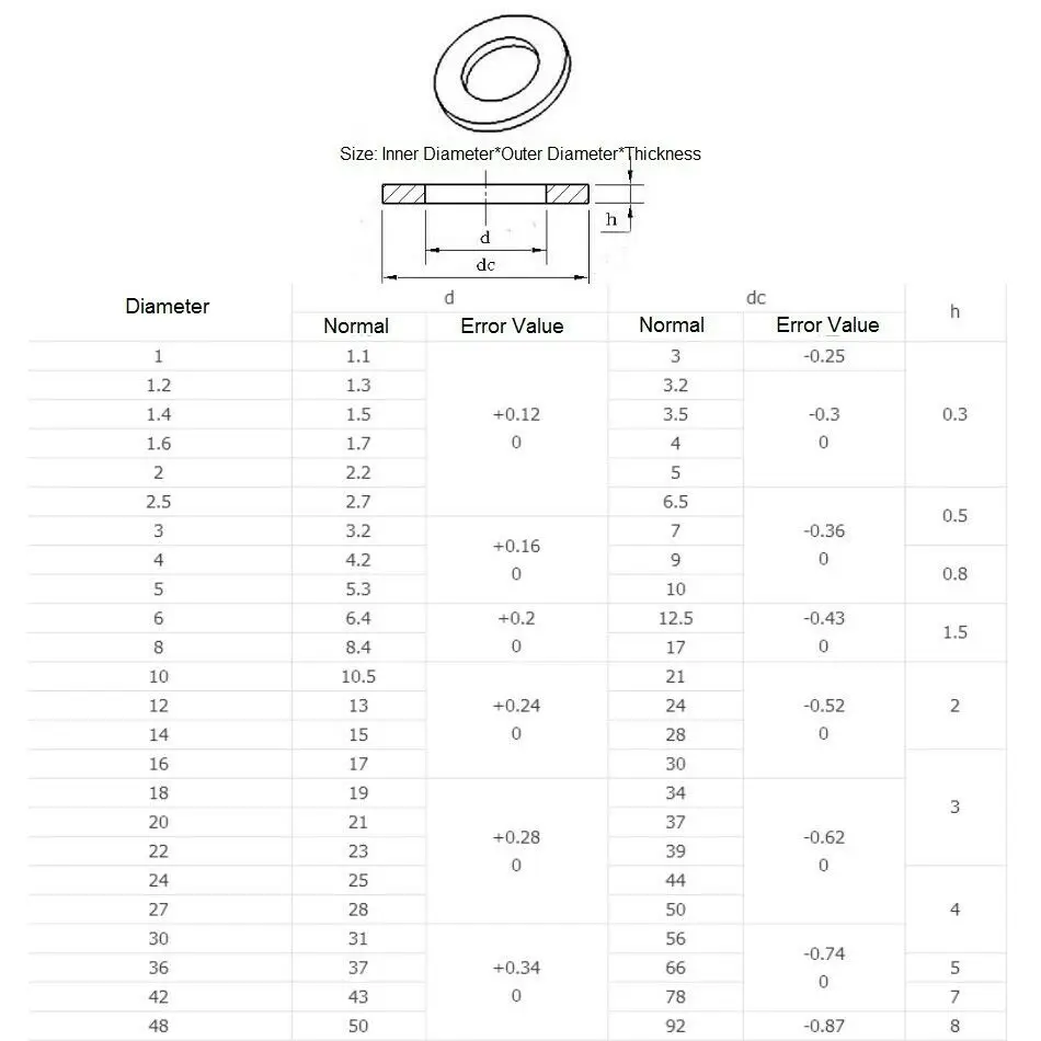 Описание размера: например M5x10x1 (Внутренний диаметр = 5 мм, внешний диаметр = 10 мм, толщина = 1 мм).