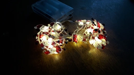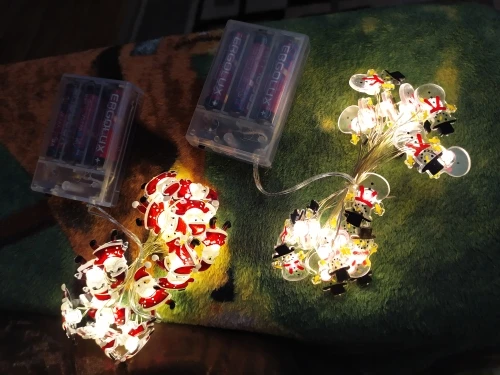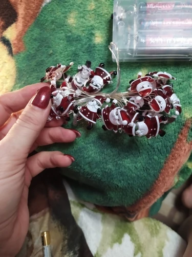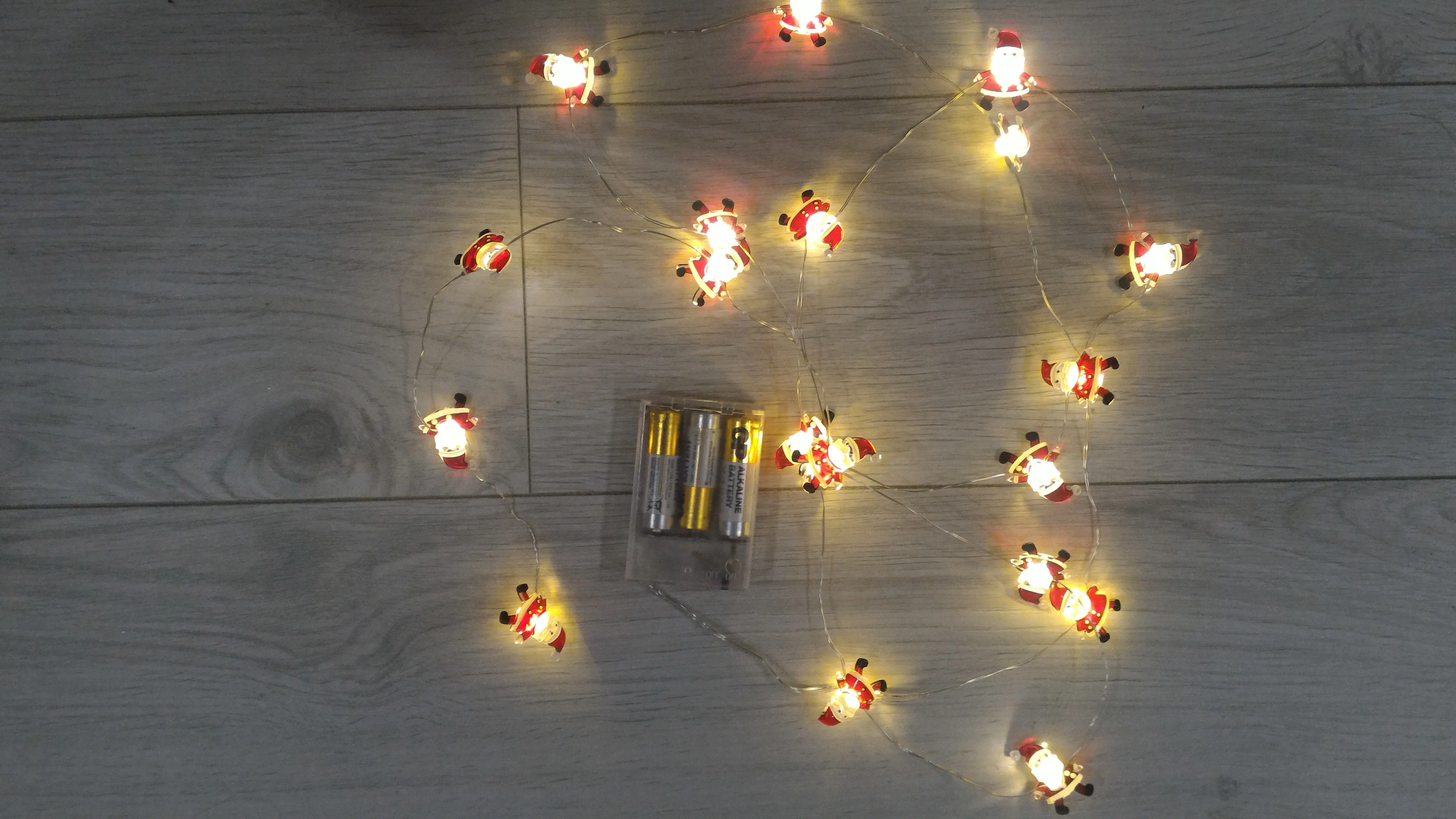 Гирлянда очень миленькая, батарейками в преддверии Нового года я запаслась, так что сразу можно было украшать ёлку. Все хорошо работает. Только сама коробочка для батареек плохо закрывается. Санта Клаусы очень мелкие, но в описании все размеры указаны, будьте внимательны. Я не была, так что удивилась крошечным фигуркам)))).