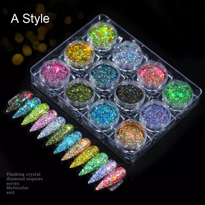12 банок/набор блеск для ногтей хит продаж набор цветной голографический блеск для ногтей пыль хромированная пудра Лазерная Пыль для украшения ногтей OP12