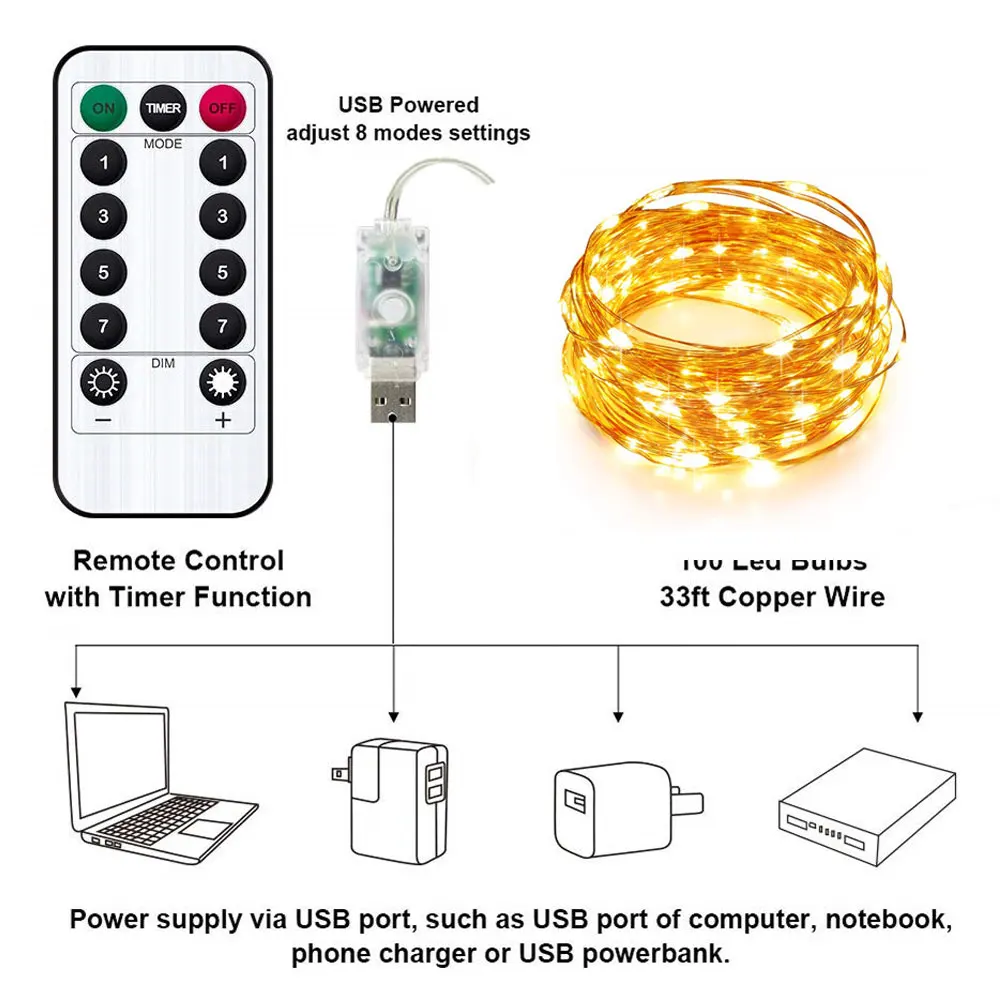 1. Комбинация 2. В волне 3. Последовательный 4. Переменный 5. Чеканка/вспышка 6. Медленное выцветание 7. Мерцание/вспышка 8. Стабильный Таймер: контроль времени, включение 6 часов и выключение 18 часов циркулярно каждый день тусклый-: Темный тусклый +: яркая посылка включает в себя: 5 м или 10 м/20 М медный провод светодиодный светильник с пультом дистанционного управления