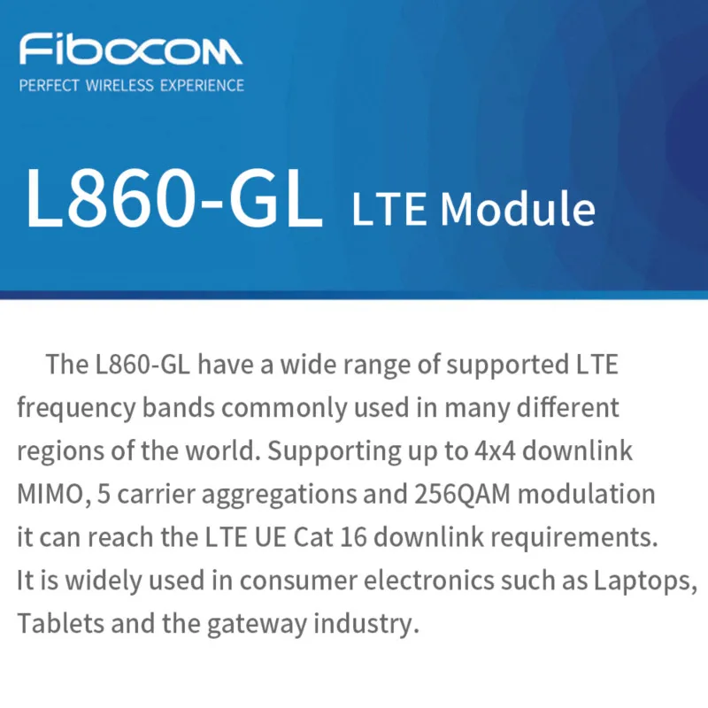 Fibocom L860-GL-это модуль для передачи данных LTE CAT-16 M.2 на базе чипсета Intel XMM7560.L860-GL имеют широкий спектр поддерживаемых диапазонов частот LTE, которые широко используются во многих различных регионах мира.Поддержка до 4x4 downlink MIMO, 5 несущих агрегатов и модуляции 256QAM может достигать LTE UE Cat 16 downlink требований.Он широко используется в бытовой электронике, такой как ноутбуки, планшеты и индустрия шлюзов.