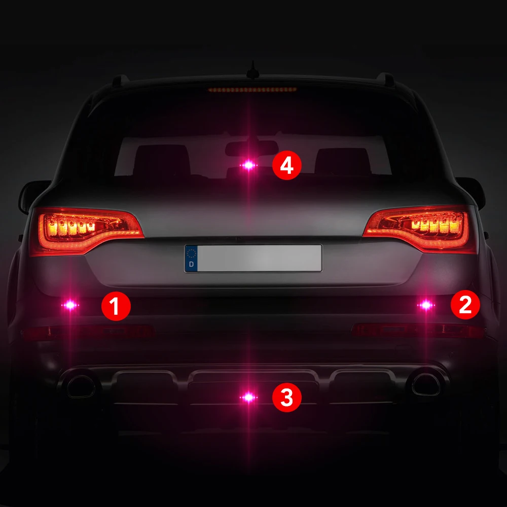 Новейшая разработка лазерных противотуманных светильник р проходит через установку красного лазерного передатчика в задней части автомобиля для проецирования лазерного луча через воздух на землю в дождь и туман. Его легче найти, чем у традиционных противотуманных светильник р, и проникающая способность у них сильнее. Может напоминать транспортному средству о безопасном расстоянии. Лазерный луч стреляет вниз с определенным углом наклона, чтобы гарантировать отсутствие прямого воздействия на глаза. Откройте светильник в солнечную погоду, чтобы увидеть только красную линию, проецируемую на земле, не нужно беспокоиться, что он защитит номерной знак автомобиля.