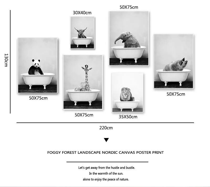 Детский плакат с изображением животных в ванне, панда, жираф, слон, Лев, свинья, корова, картина на стену для детской комнаты, Скандинавская картина, декор для детской комнаты