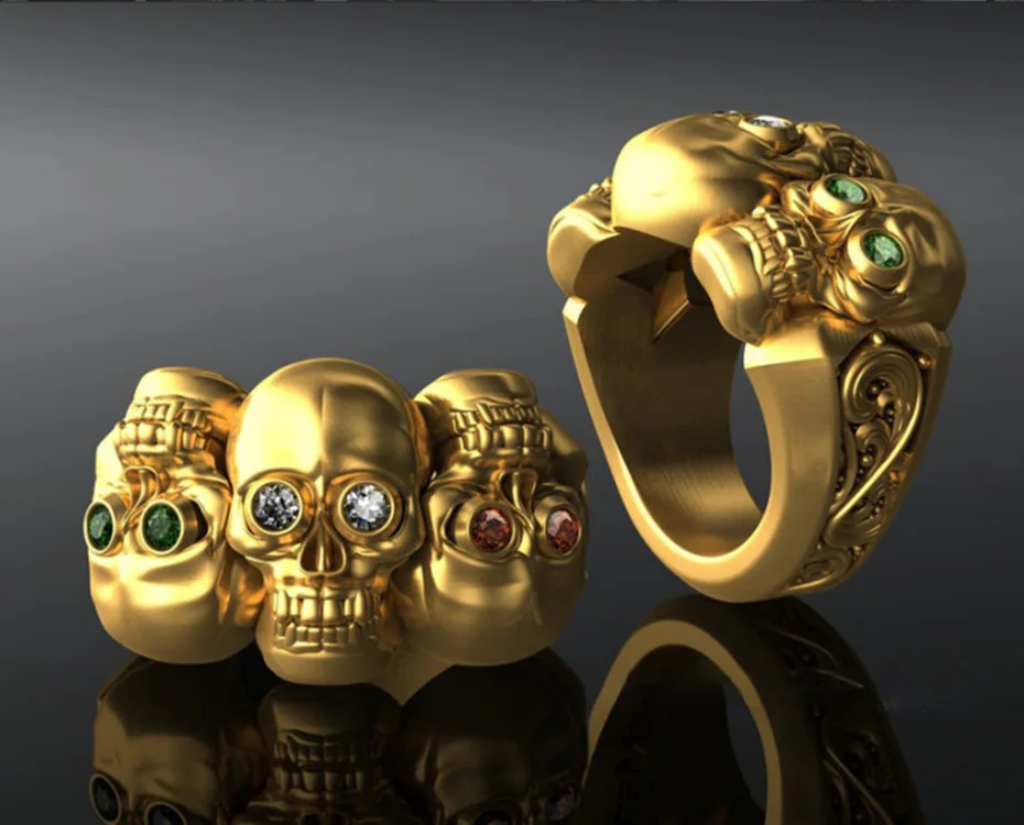 Креативные золотые дизайнерские кольца с тремя черепами и красочными глазами для мужчин, панк, готика, ювелирные изделия для вечеринок, подарок