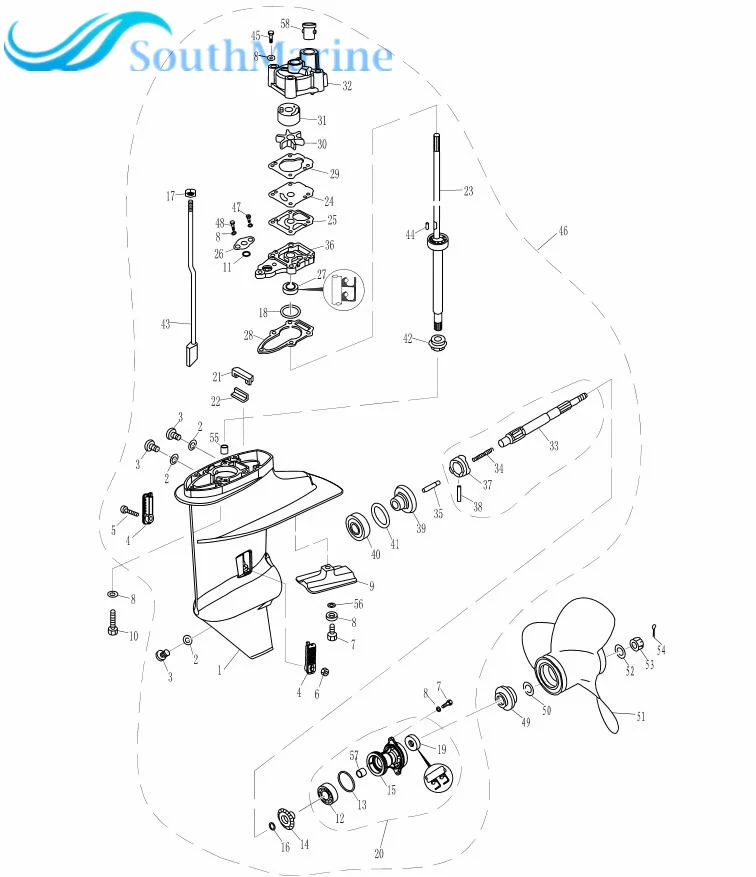 2004 9.8HP 1010203 см корпус шестерни (вал пропеллера)