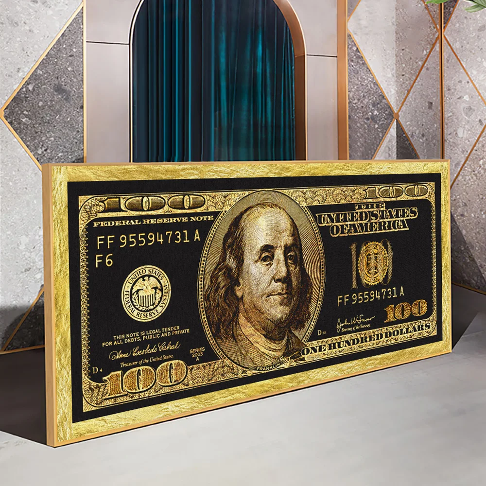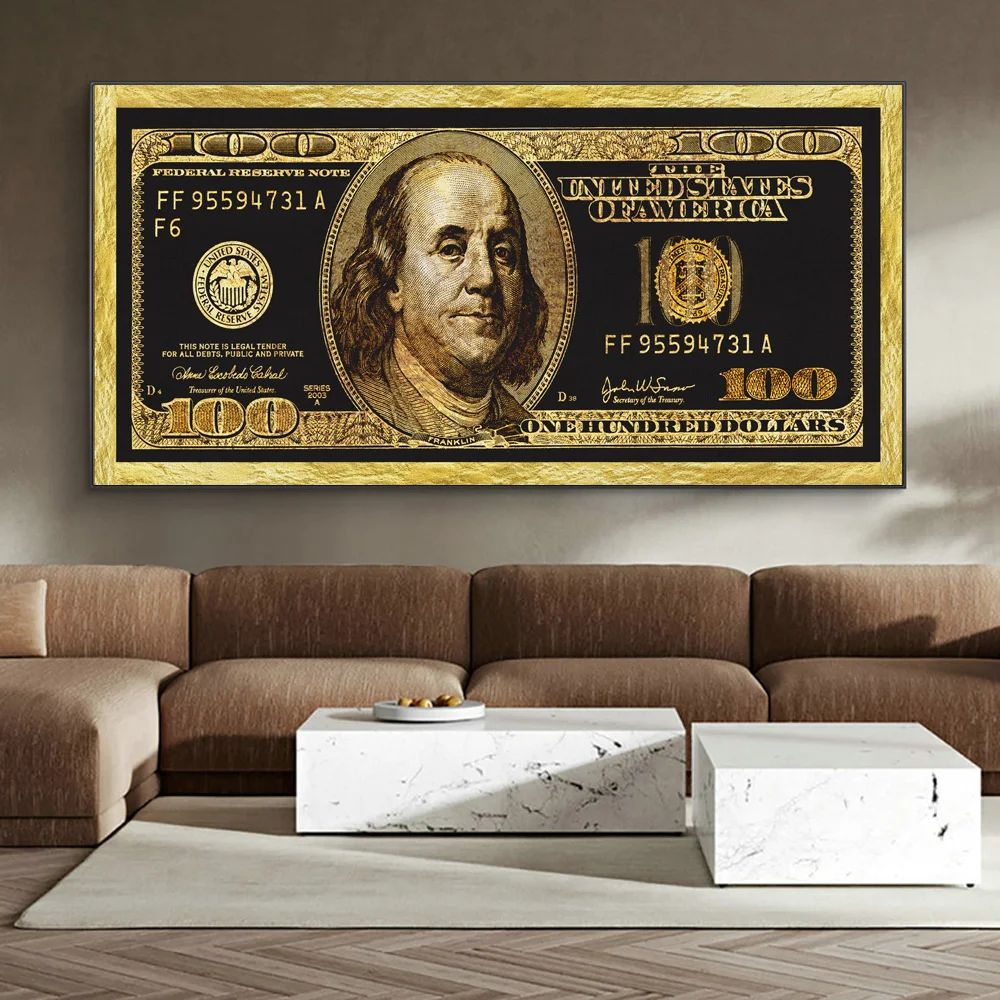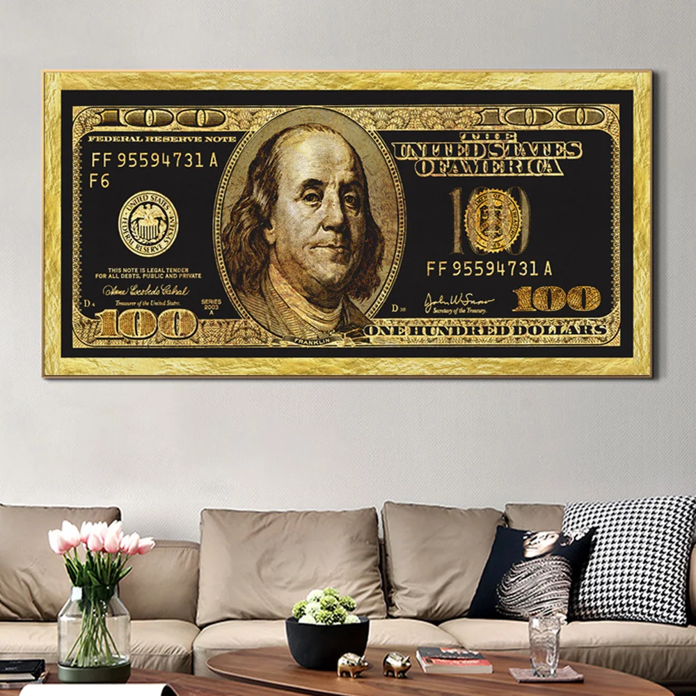 Постеры и печатные картины, золотые, 100 долларов, Билл, для гостиной, современное модное настенное искусство, картина наличными на холсте без рамки
