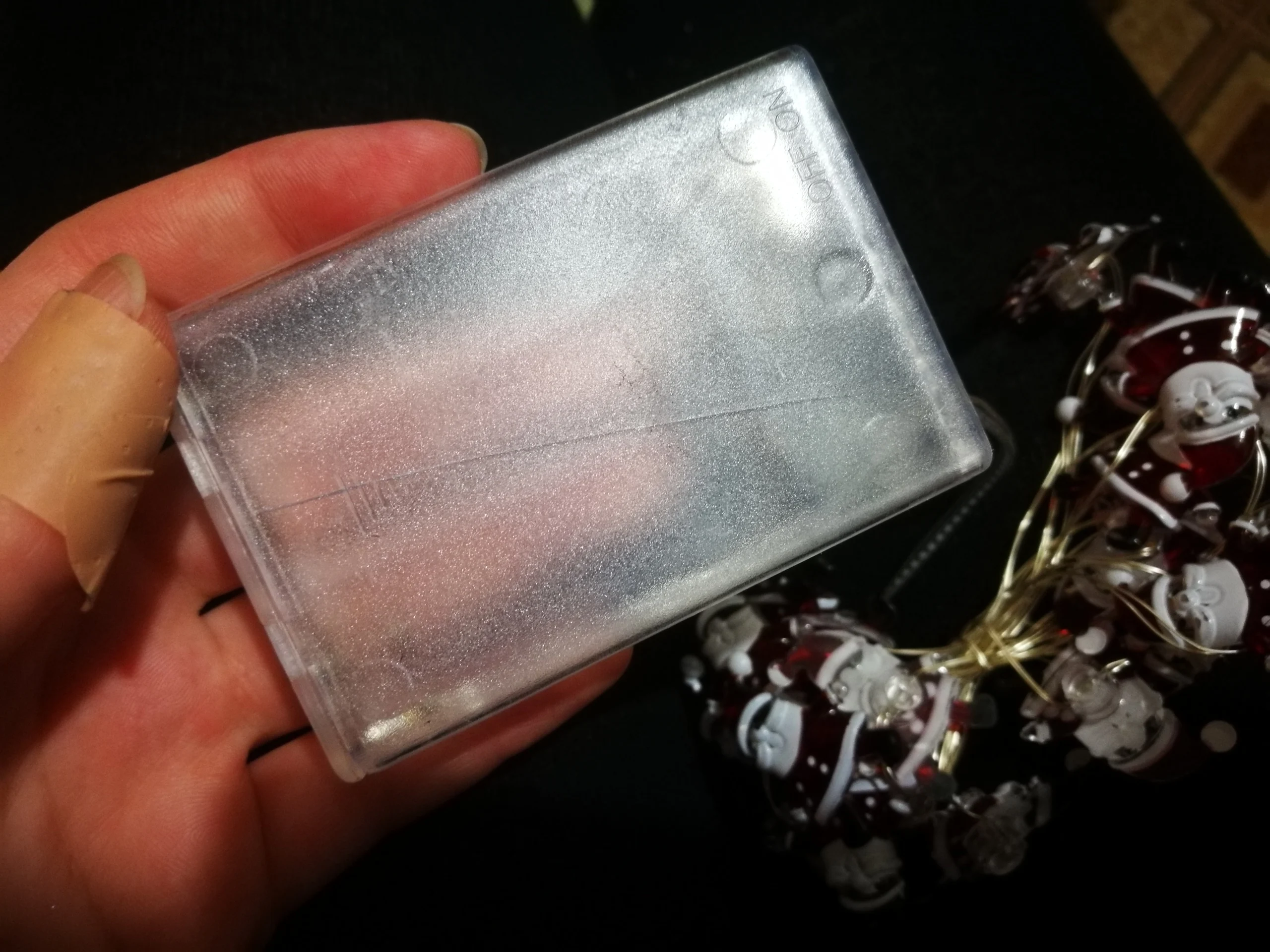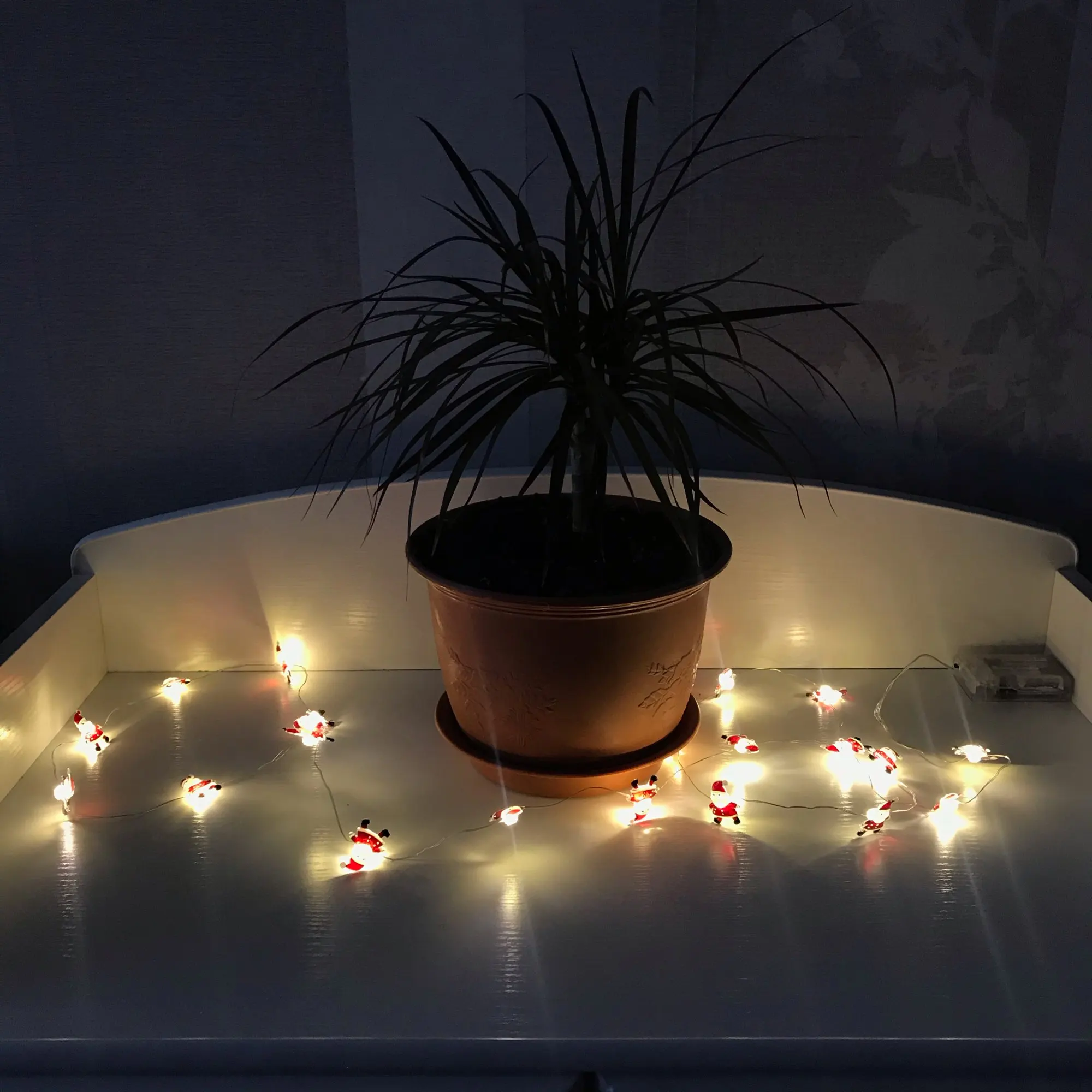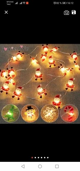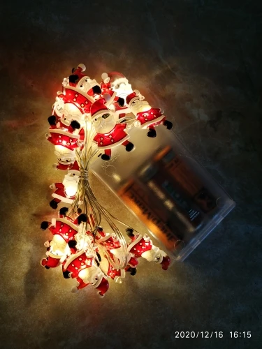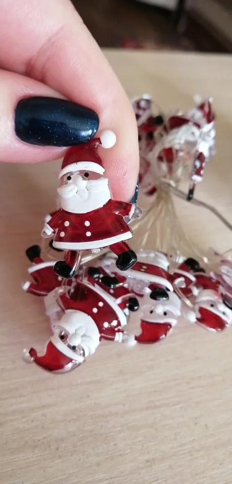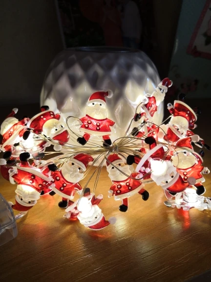 Доставка 2 недели. На выбор 6 вариантов, я заказала с дедом морозом. Изделие работает от трех батареек типа АА (пальчиковые), не в комплекте. Гирлянда двухметровая. Всего на ней 20 фигурок. Размер каждой не больше трех сантиметров. Материал - пластик Изделие смотрится интересно. Испускаемый свет - теплый. Качество хорошее. Все работает, включается нажатием переключателя на блоке. Санты хорошо прорисованы. Гирлянда понравилась. Стоимость сейчас всего 180 рублей. Прекрасный элемент создания праздничного настроения.