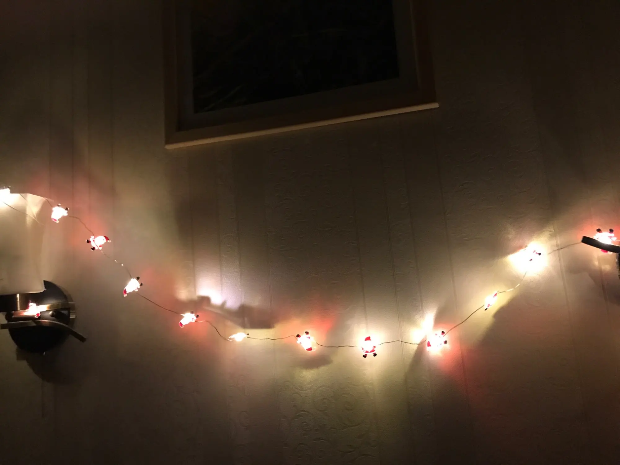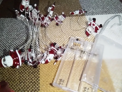 Как на картинке. Работает от 3х пальчиковых батареек. Санты съёмные, на защёлках. Когда распакуете, прощёлкайте их, чтоб плотненько застегнулись. На гибкой проволочке. Отличная гирлянда