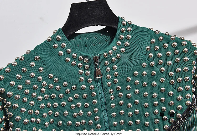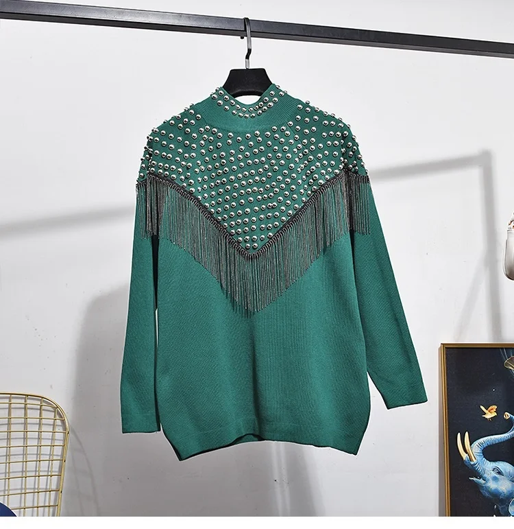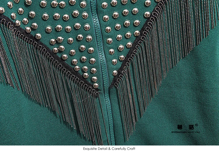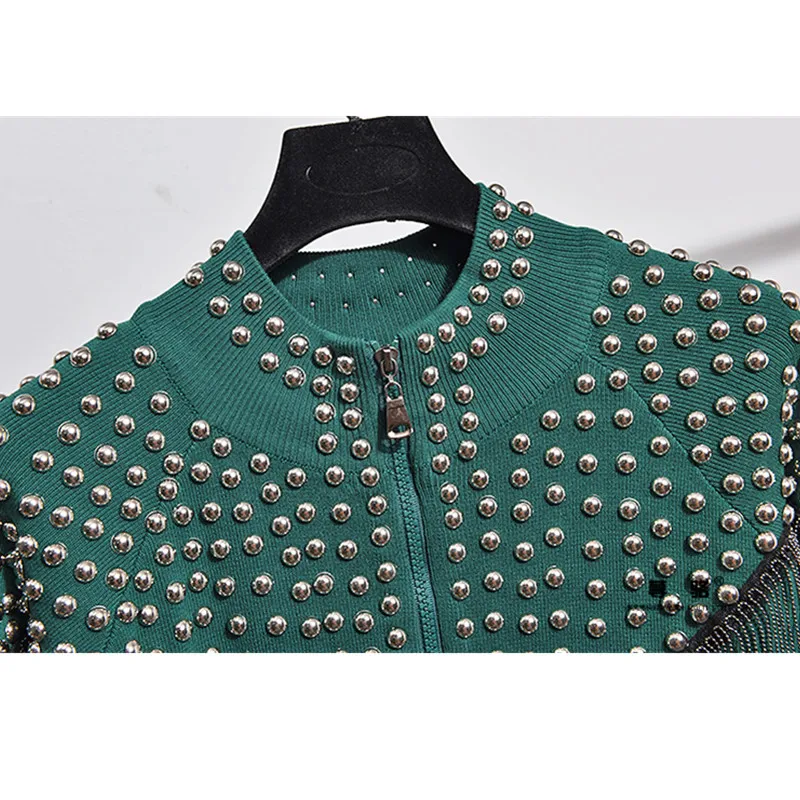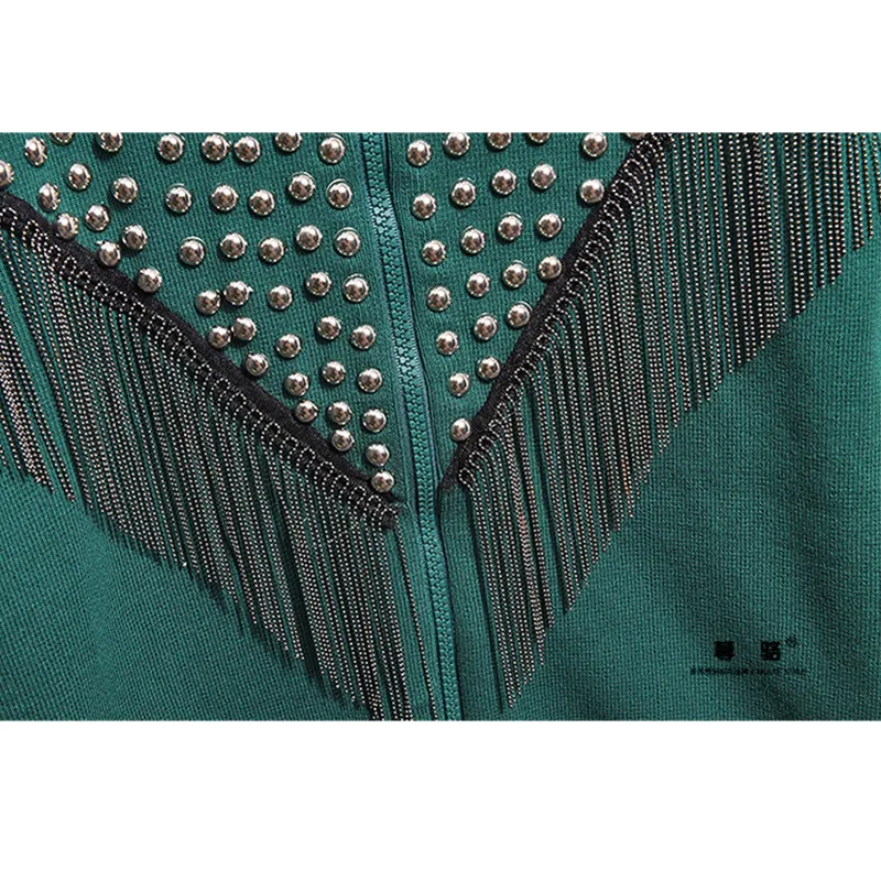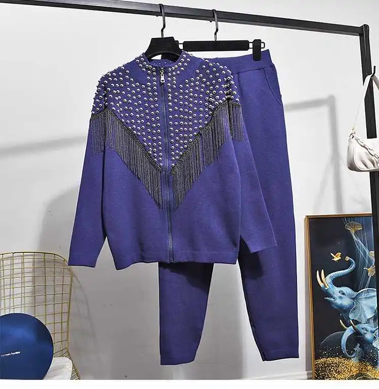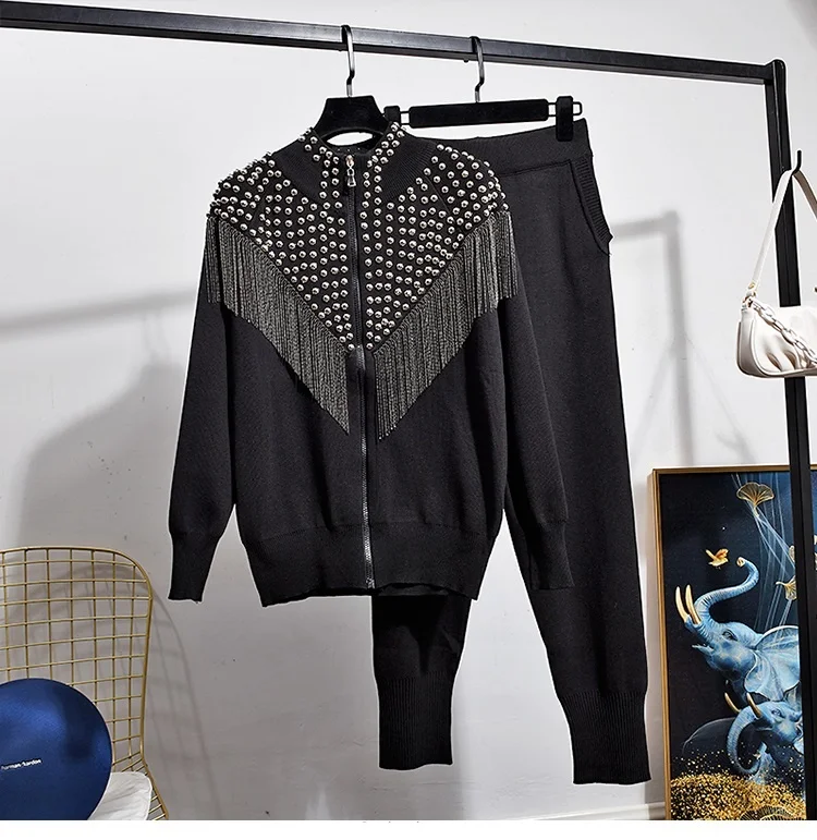 Вязаный спортивный костюм для женщин, с цепочкой и заклепками, кардиган с кисточками, свитер, длинные штаны, свободный, зеленый, фиолетовый, черный, вязаный костюм для женщин