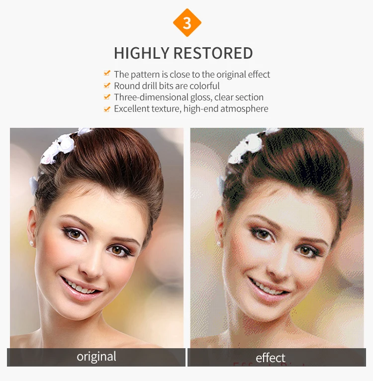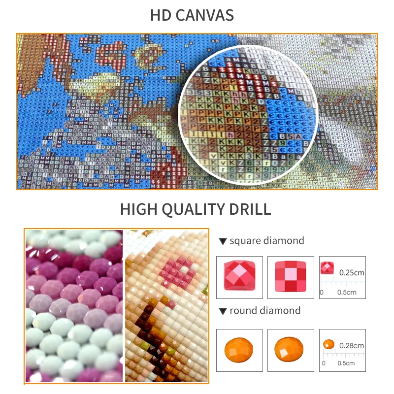 О эффекте: чем больше размер, тем лучше эффект. Размер каждого алмаза 2,5x2,5 мм. Если изображение сложное, то изображение маленького размера будет выглядеть не очень красиво. Пожалуйста, свяжитесь с нами, если вам нужен больший размер всех изображений.