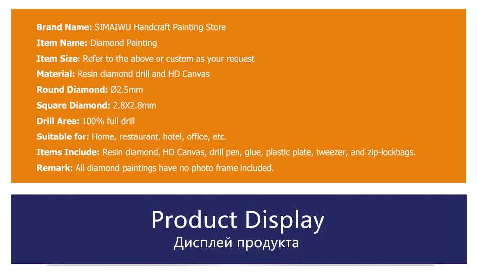 О нас: Наша Алмазная краска полуфабриката, рамка в комплект не входит. Мы предоставим инструменты для алмазной вышивки для вашего бренда. И мы поместим более 30% алмазов из смолы. Наши товары могут быть не самыми дешевыми, но качество наилучшее. Мы будем рады, если вы поделитесь с нами своими готовыми картинами.