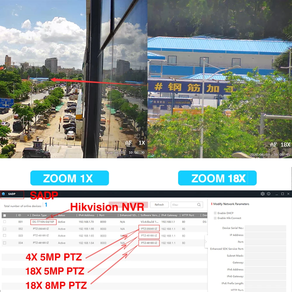 5/8MP 18X PTZ Network Camera· 5MP:1/2.8” 5Megapixel CMOS 8MP:1/2.8” 8Megapixel CMOS· Powerful 18X optical zoom , Digital Zoom 30X· WDR, Day/Night(ICR), DNR· 5MP:Max. 20fps 5MP / 30fps 4MP 8MP:Max. 20fps 8MP / 30fps 6MP· Pan Range:0° to 360°,Tilt Range:-15° to 90°· Support PoE· Compatibility: HIKVISION,ONVIF· IP66