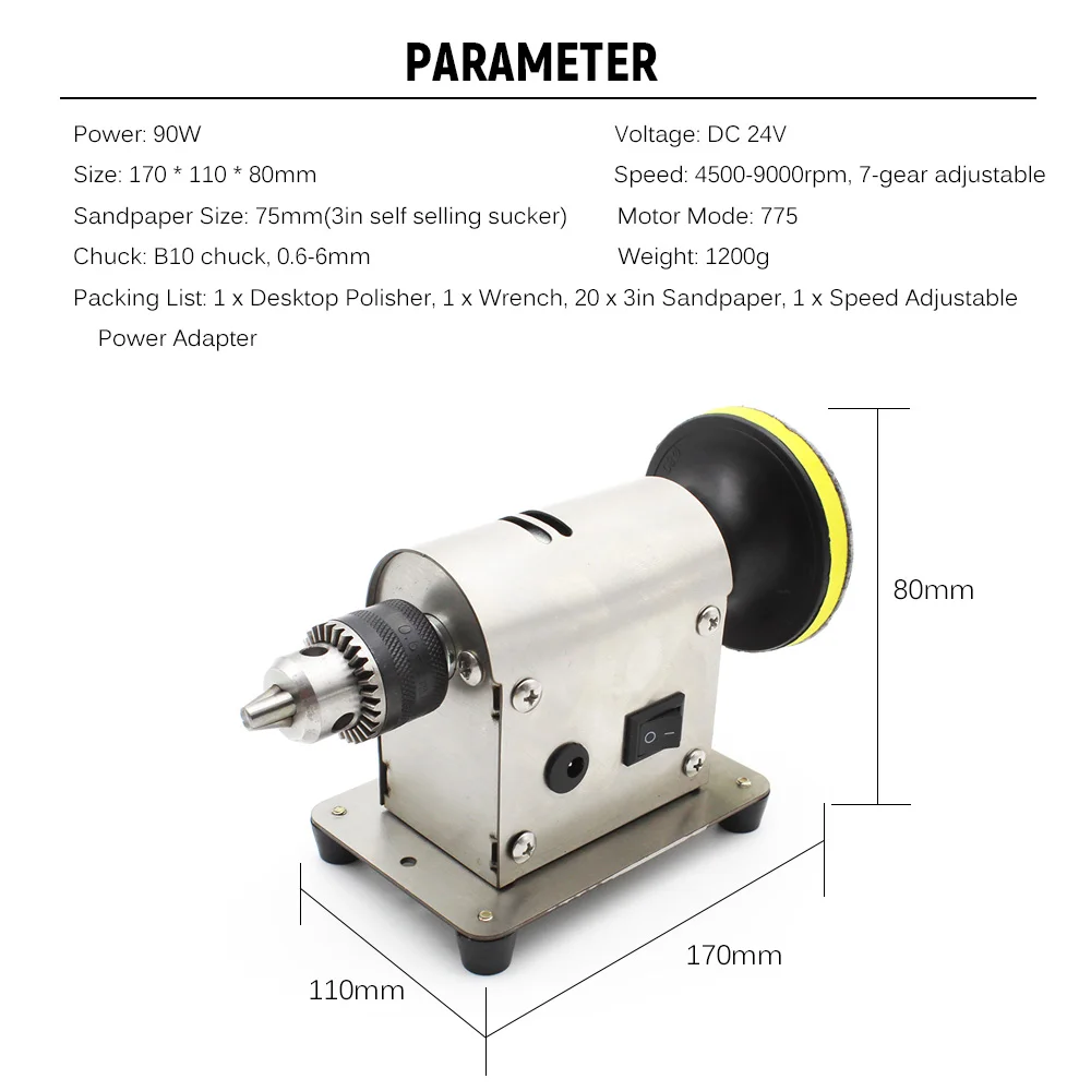 Особенности:Мощный двигатель --- высокоскоростной двигатель поддерживает скорость от 4500 об./мин до 9000 об./мин, что может помочь вам обрабатывать большинство ювелирных изделий рок творческой работы.Универсальный патрон --- патрон 0,6-6 мм может подходить для большинства режущих бистов, сверл, щеток и т. Д. (Не входит в комплект). Так что машина может делать резку, резьбу, сверление, шлифовку, полировку, фрезерование, измельчение, шлифовка, чистка, удаление и т. Д.7 уровня скорости регулируемый --- подача заявки на поставляются с 7 редуктор скорости Регулируемый адаптер питания и простое управление и эффективную работу.Широкое применение-может использоваться для полировки ювелирных изделий, нефрита, резьбы по камню, резьбы по дереву, золота, протезов, резьбы по дереву и т. д.Премиум качество --- все металлические конструкции оболочки, твердые, прочные и износостойкие, имеют длительный срок службы.Спецификация:Штекер: UKМощность: 90 ВтНапряжение: 24 В постоянного токаСкорость: 4500-9000 об/минAdjustabtable скорость: 7 уровня регулировки скоростиРазмер наждачной бумаги: 75 мм (3 дюйма самопродающиеся присоски)Двигатель режим: 775Патрон: B10 патрон, 0,6-6 ммРазмер изделия: 170*110*80 ммУпаковочный лист:1 * Настольный полировщик1 * патронный ключ20 * 3in наждачная бумага1 * Адаптер питания