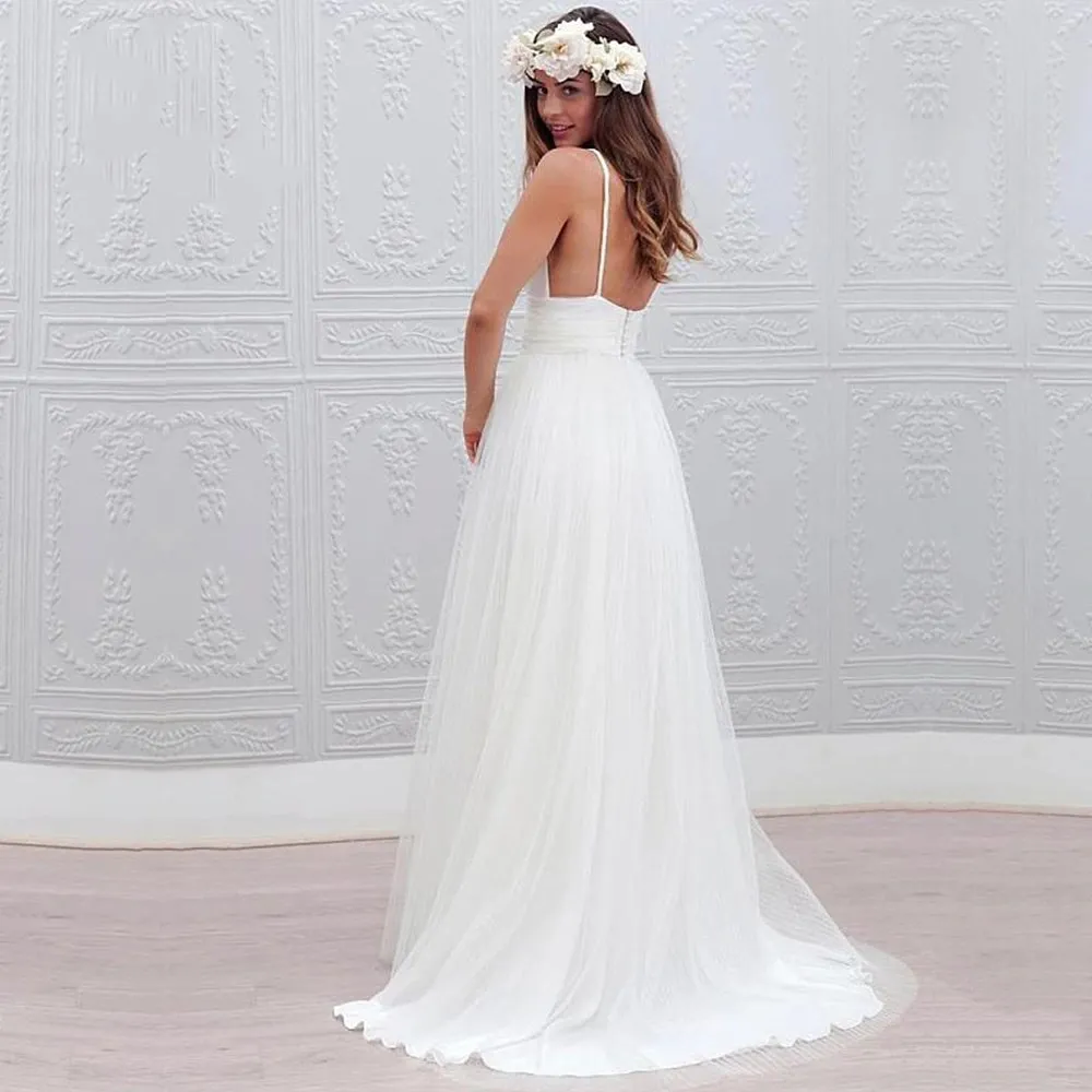 Платье Свадебное на бретелях-спагетти с V-образным вырезом, белое простое ТРАПЕЦИЕВИДНОЕ с открытой спиной, без рукавов, со шлейфом