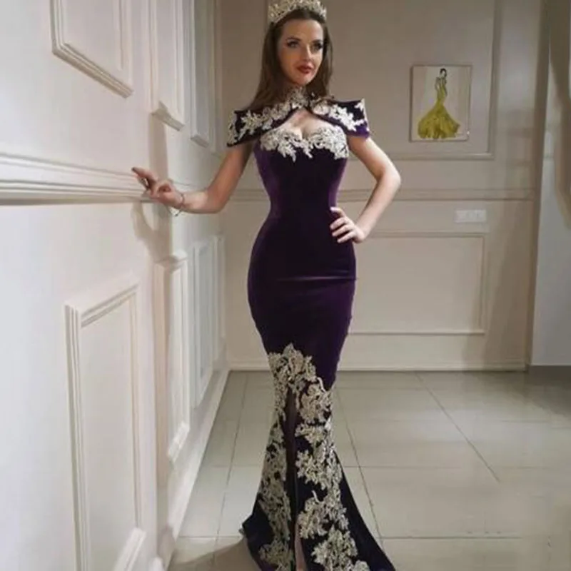 Женское длинное вечернее платье из велюра, с золотыми аппликациями