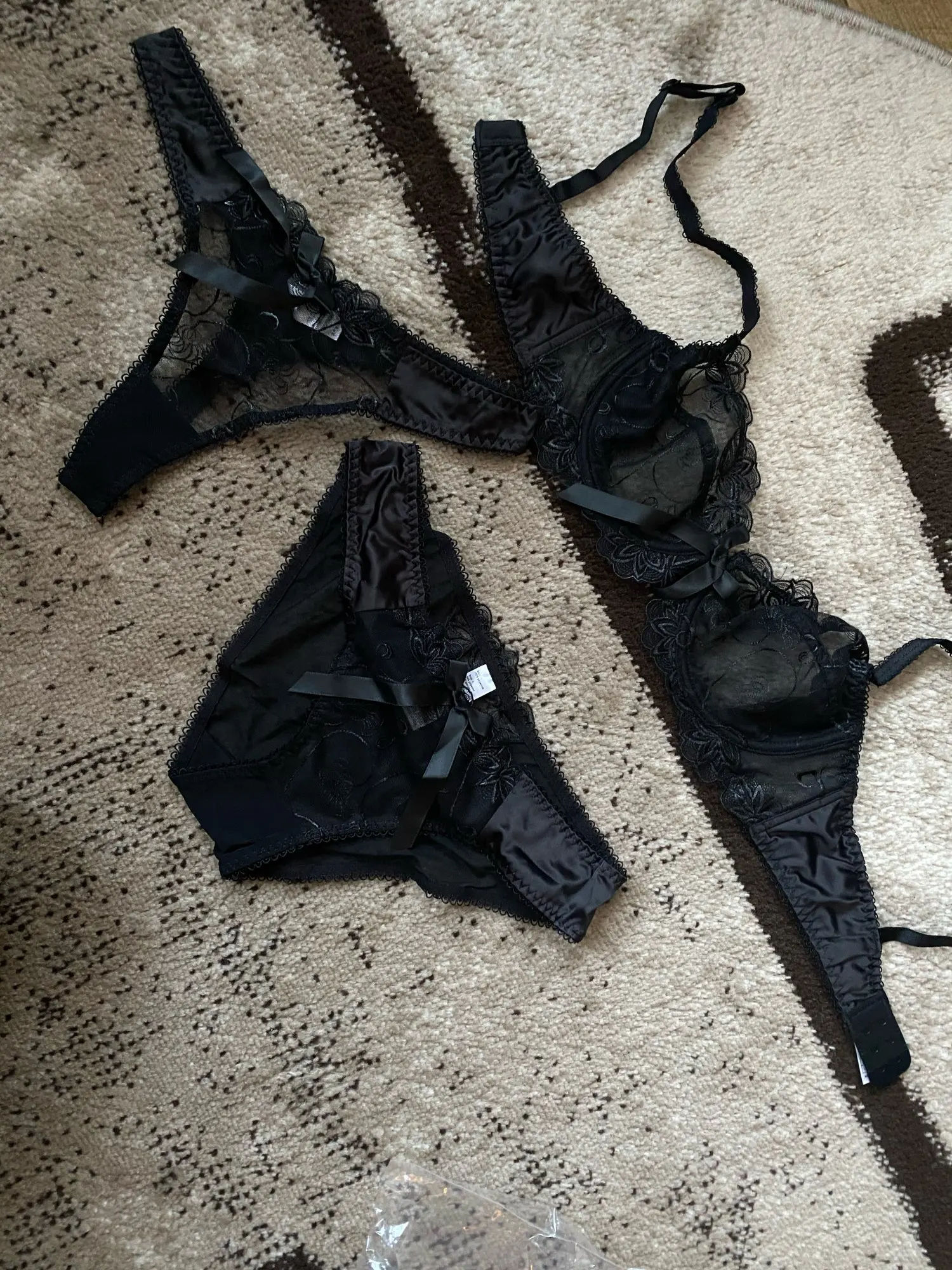 Доставка 24 дня до Алтайского края (по России 7 дней компанией DPD). Красивый, сексуальный, кружевной комплект. Бюстгальтер без пуш-апа, 2/3 части чашки 2 слоя сеточка и кружево, остальная верхняя часть одно кружево на краю которого пришита тоненькая тесьма, застёгивается на 2 крючка 3 ряда. Двое трусиков стринги и слипы полупрозрачные, кружевные со средней посадкой и хлопковой ластовицей. Качество хорошее, кружево мягкое. На ог 94, опг 81, от 80, об 100 комплект отлично подошёл, ничего нигде не давит, грудь держит хорошо. Смотрится секси. Рекомендую.