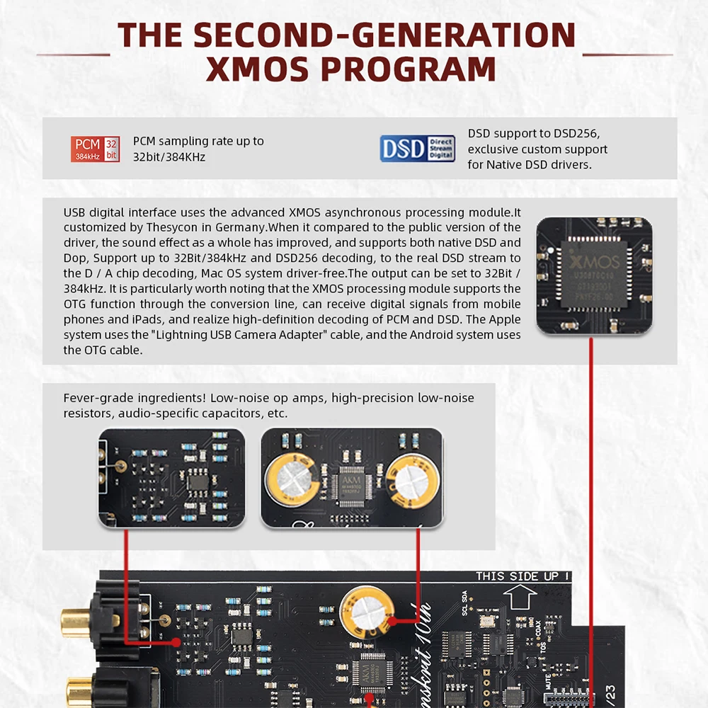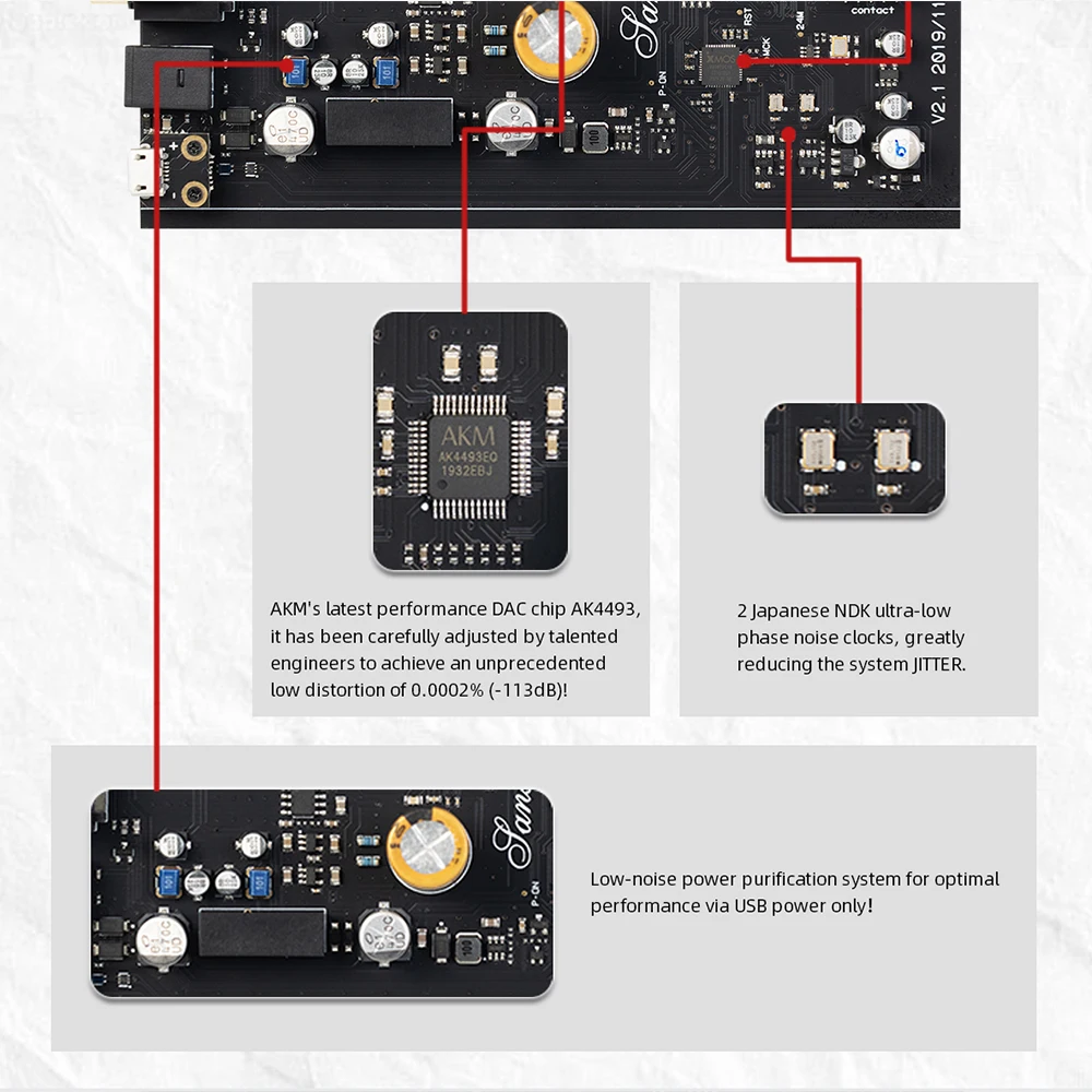 Ультра-Крошечный дизайн формы и поддерживает различные способы размещения; Решение XMOS второго поколения поддерживает частоту дискретизации до 32 бит/768 кГц и DSD256; два японских сверхнизких фазовых шумовых часов, значительно уменьшающих дрожание системы; Новый чип AKM AK4493, и тщательно отрегулировал его до беспрецедентного 0.0002%; Встроенный датчик гравитации, Автоматически переключает экран! Встроенная высокопроизводительная система фильтрации мощности, чтобы она могла достичь наилучшей производительности, используя только один usb-интерфейс для источника питания! Анодированный корпус из алюминиевого сплава с ЧПУ; Японская ассоциация электроники Hi-Res Audio certification; Полнофункциональный пульт дистанционного управления.