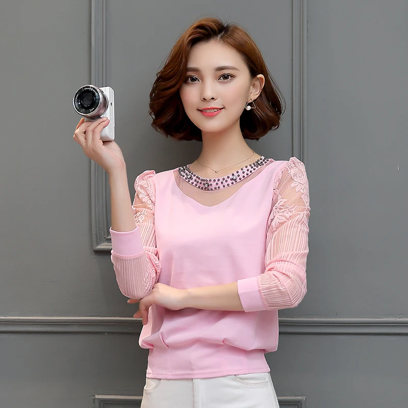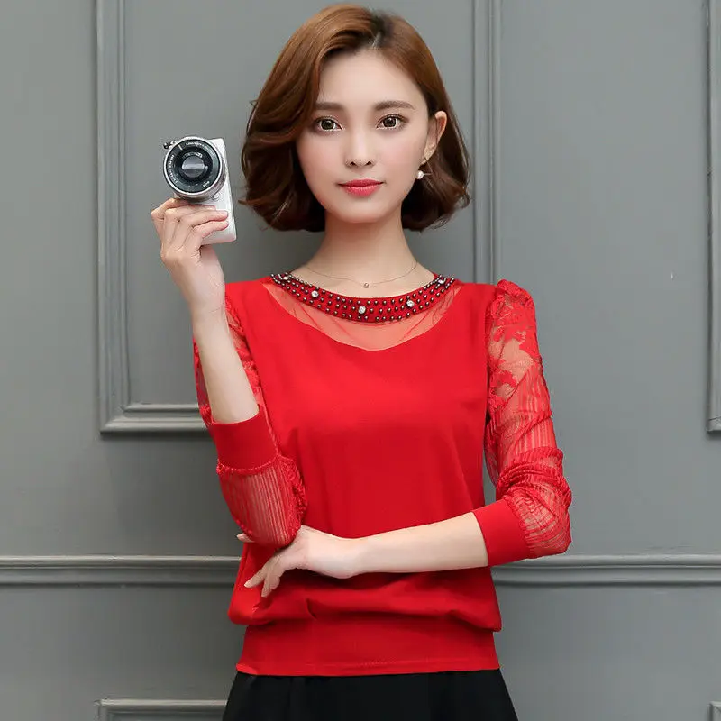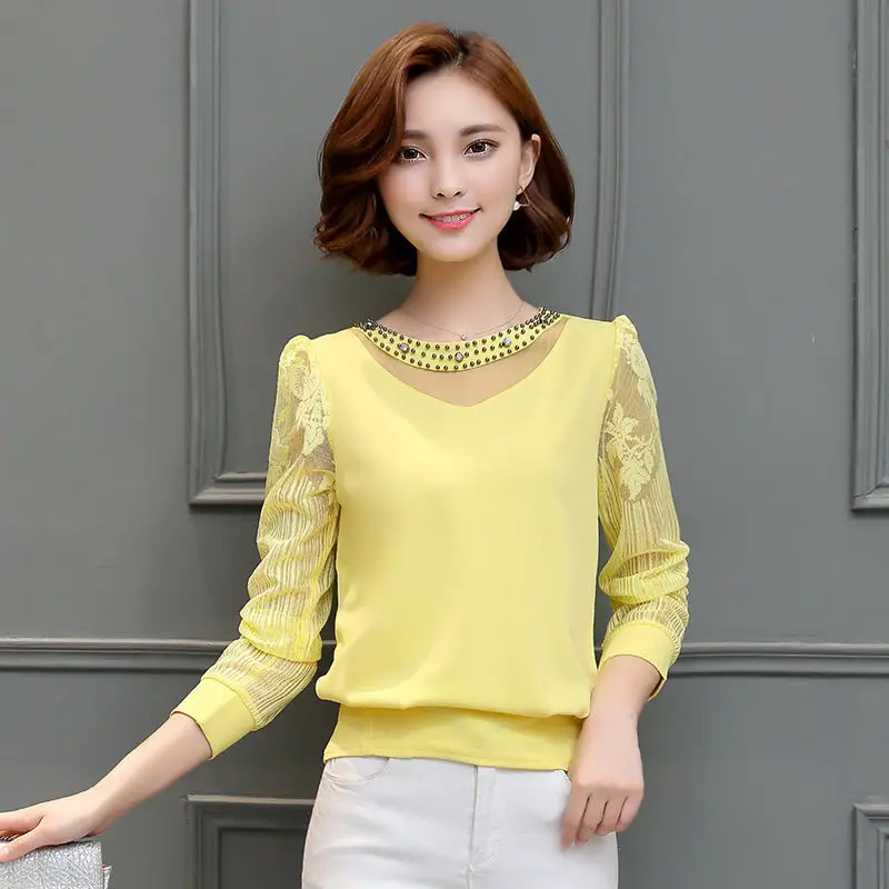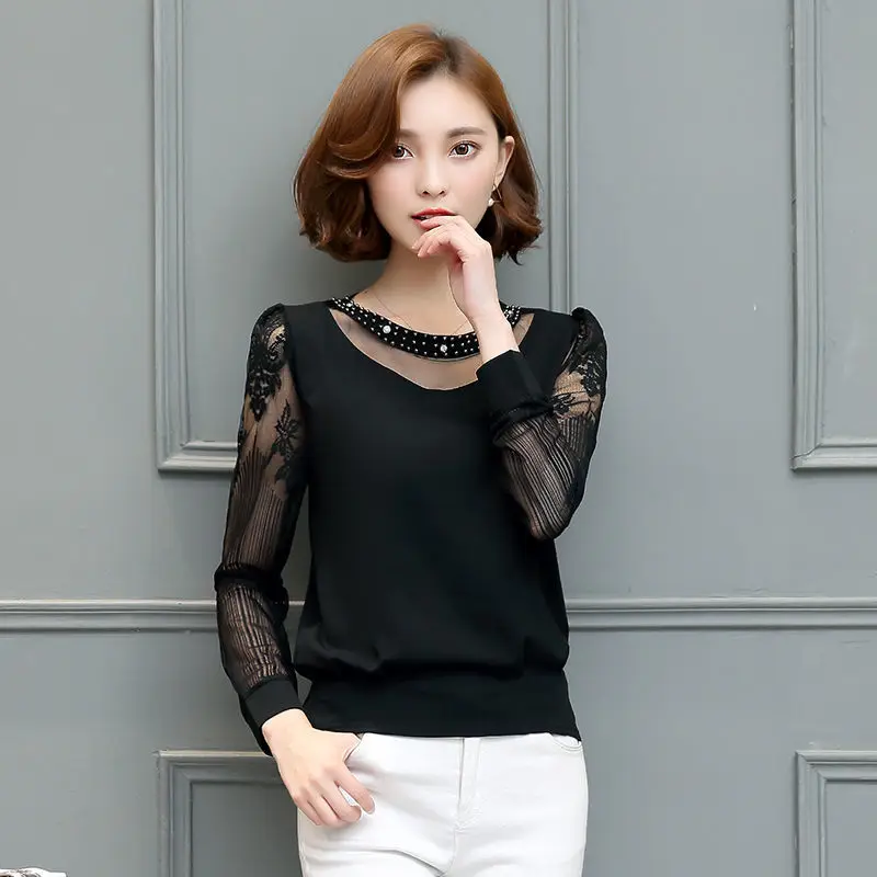Женские кружевные блузки, весна-осень, рубашки с круглым вырезом и длинным рукавом, однотонные повседневные топы DD9043